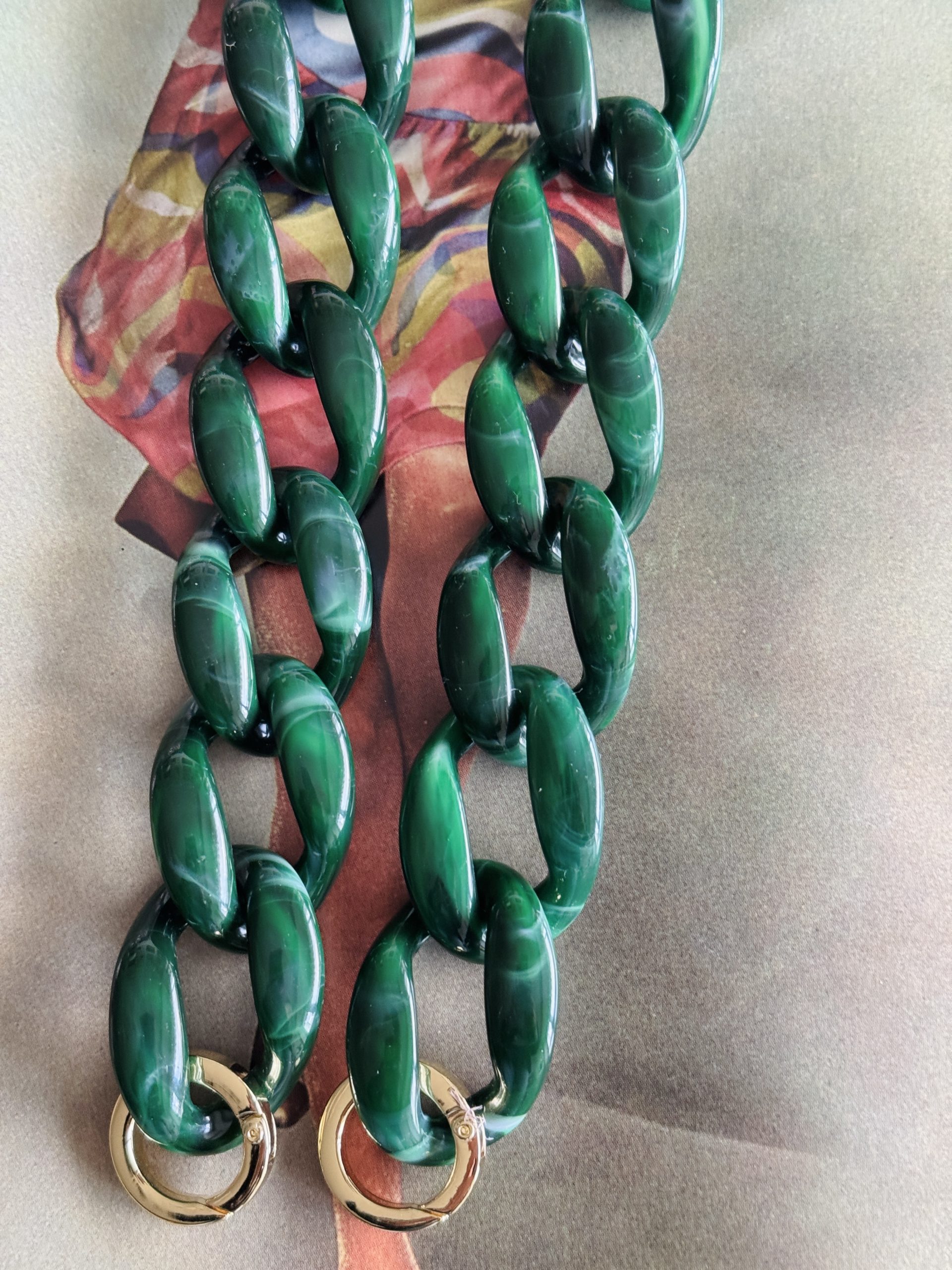 Asa de eslabones gruesas en tono verde marmolado con mosquetones dorados.