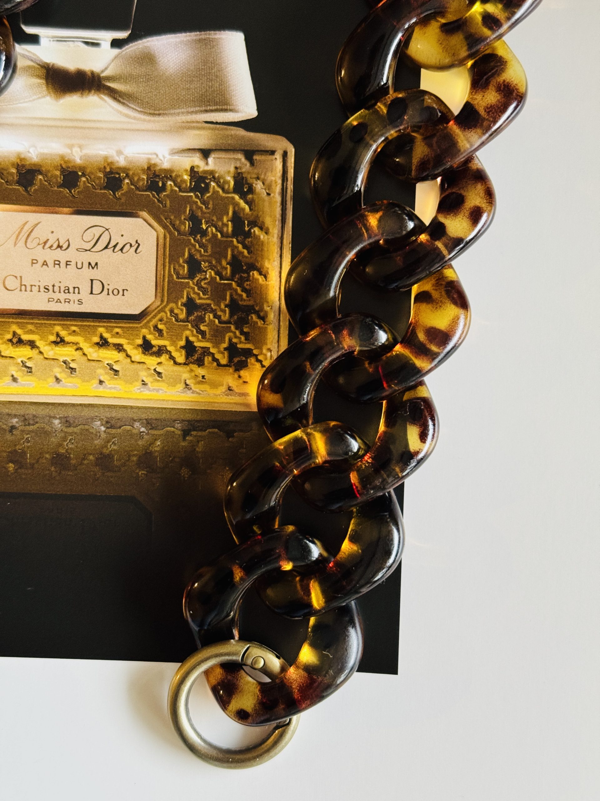 Asa de eslabones grandes en tono carey con mosquetones dorados.