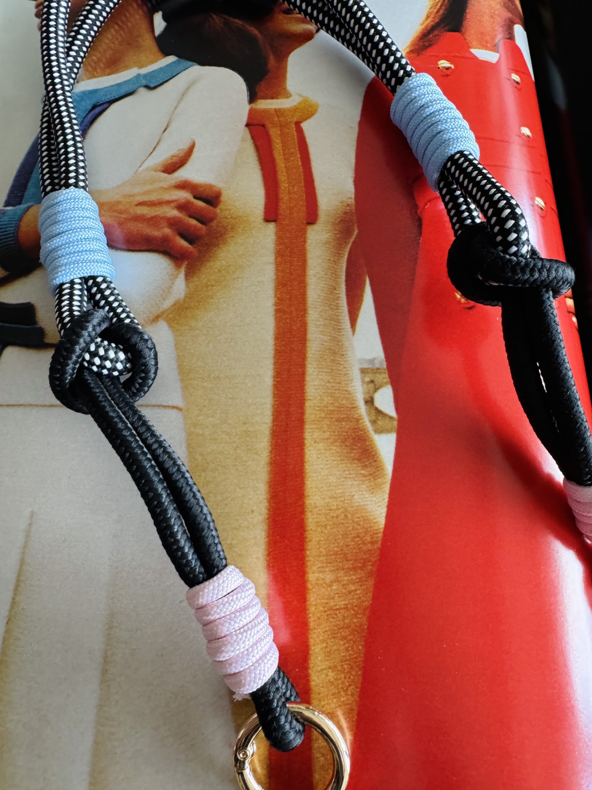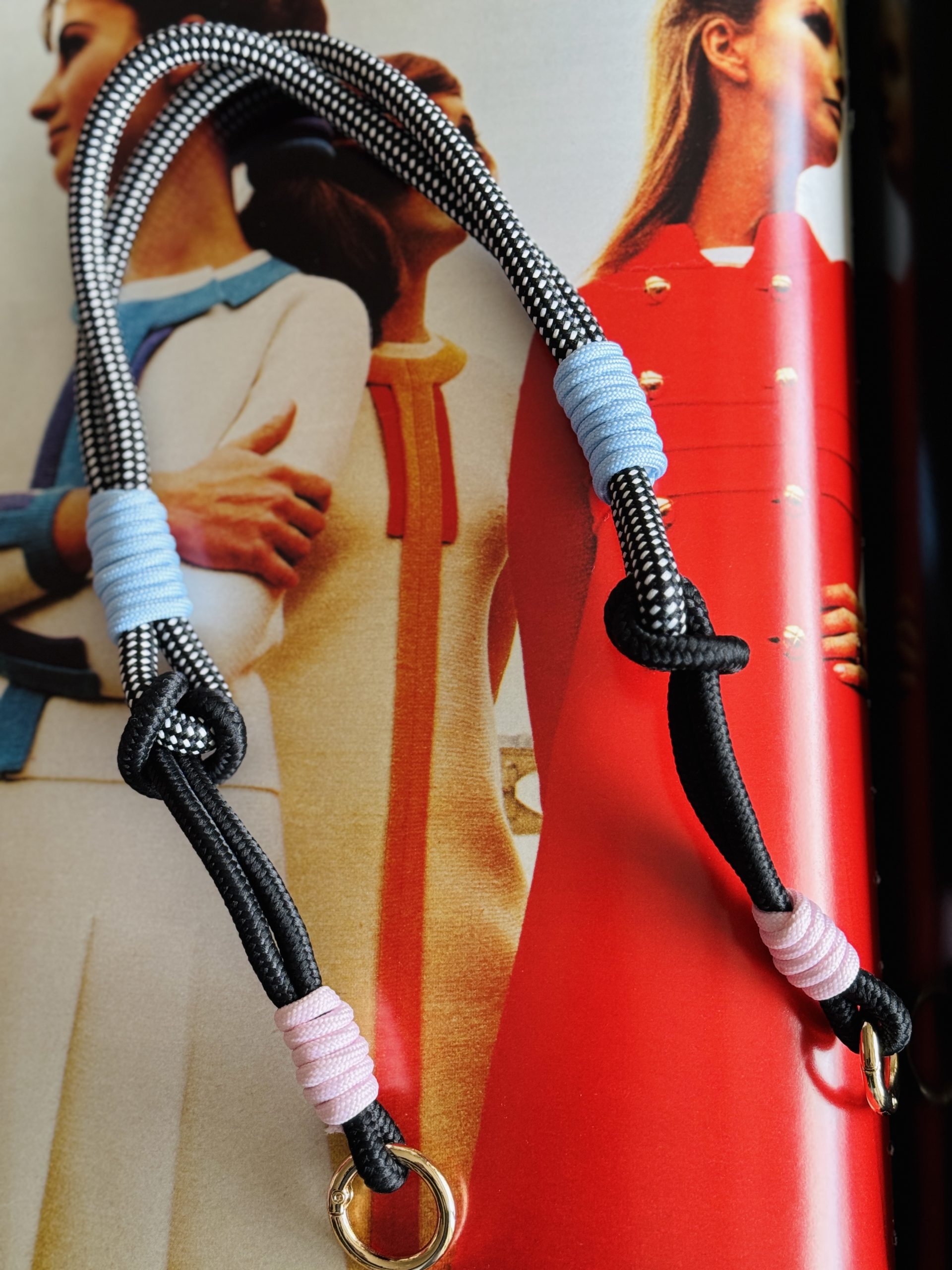 Asa de cuerda y nylon corta, en colores negros combinada con azul, rosa y blanco. Acabado en mosquetón oro.