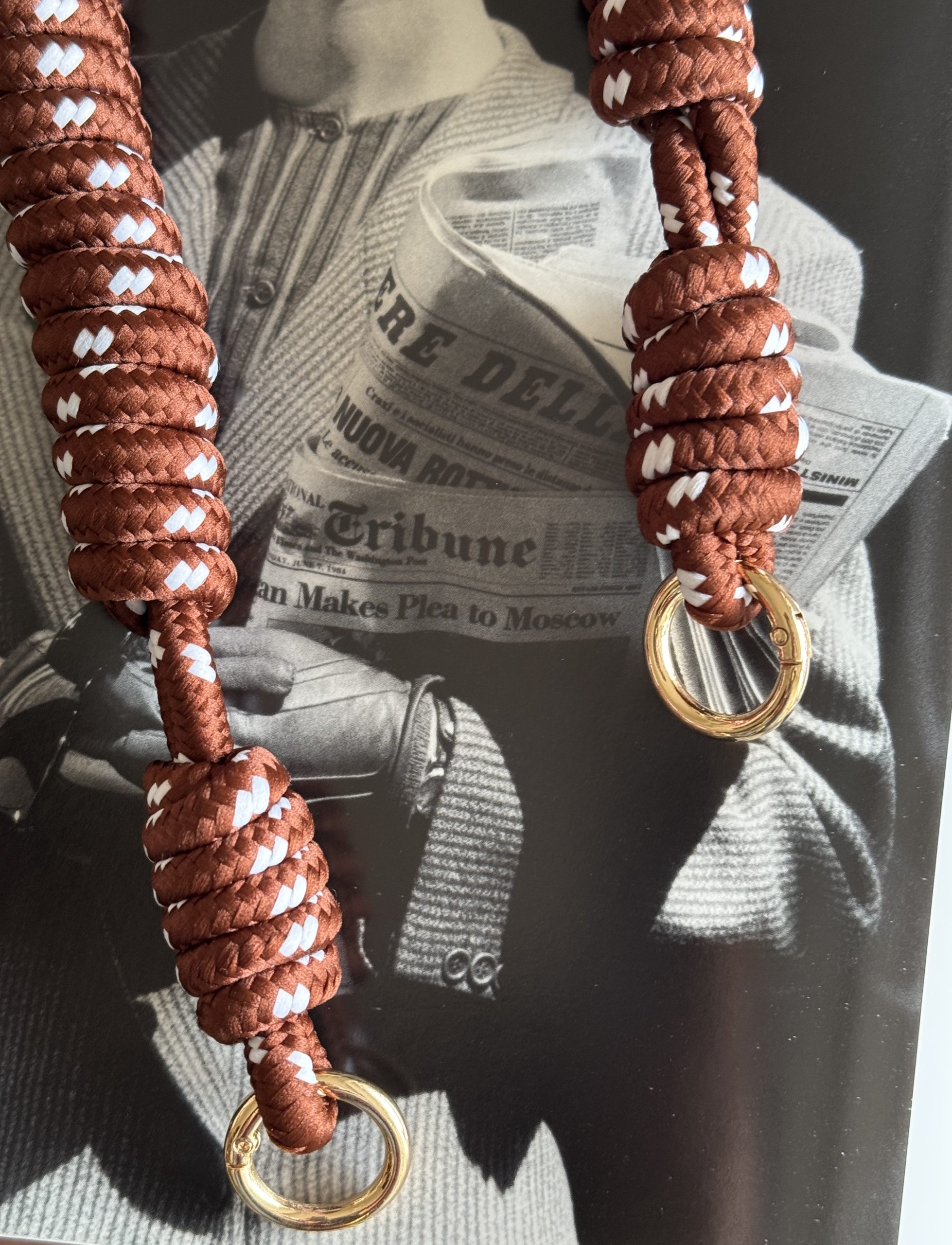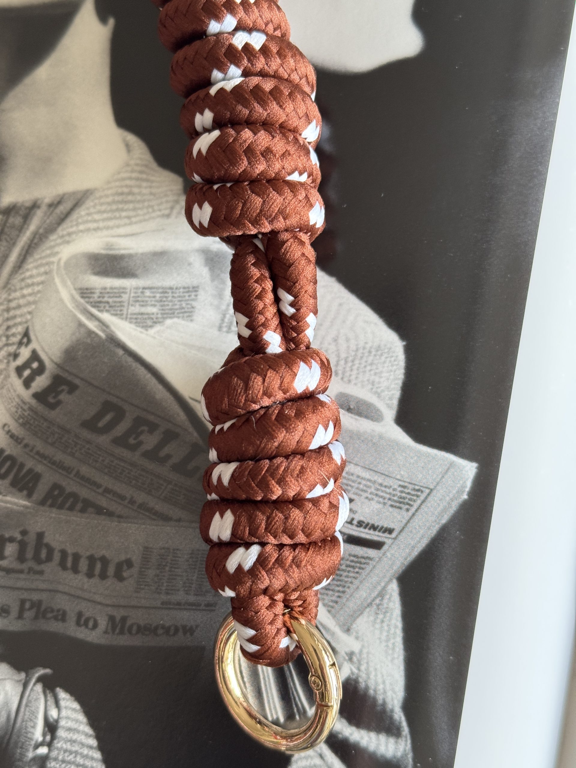 Tejido trenzado de cuerda. Color marrón. Anillas oro para poder enganchar a las Carteras.