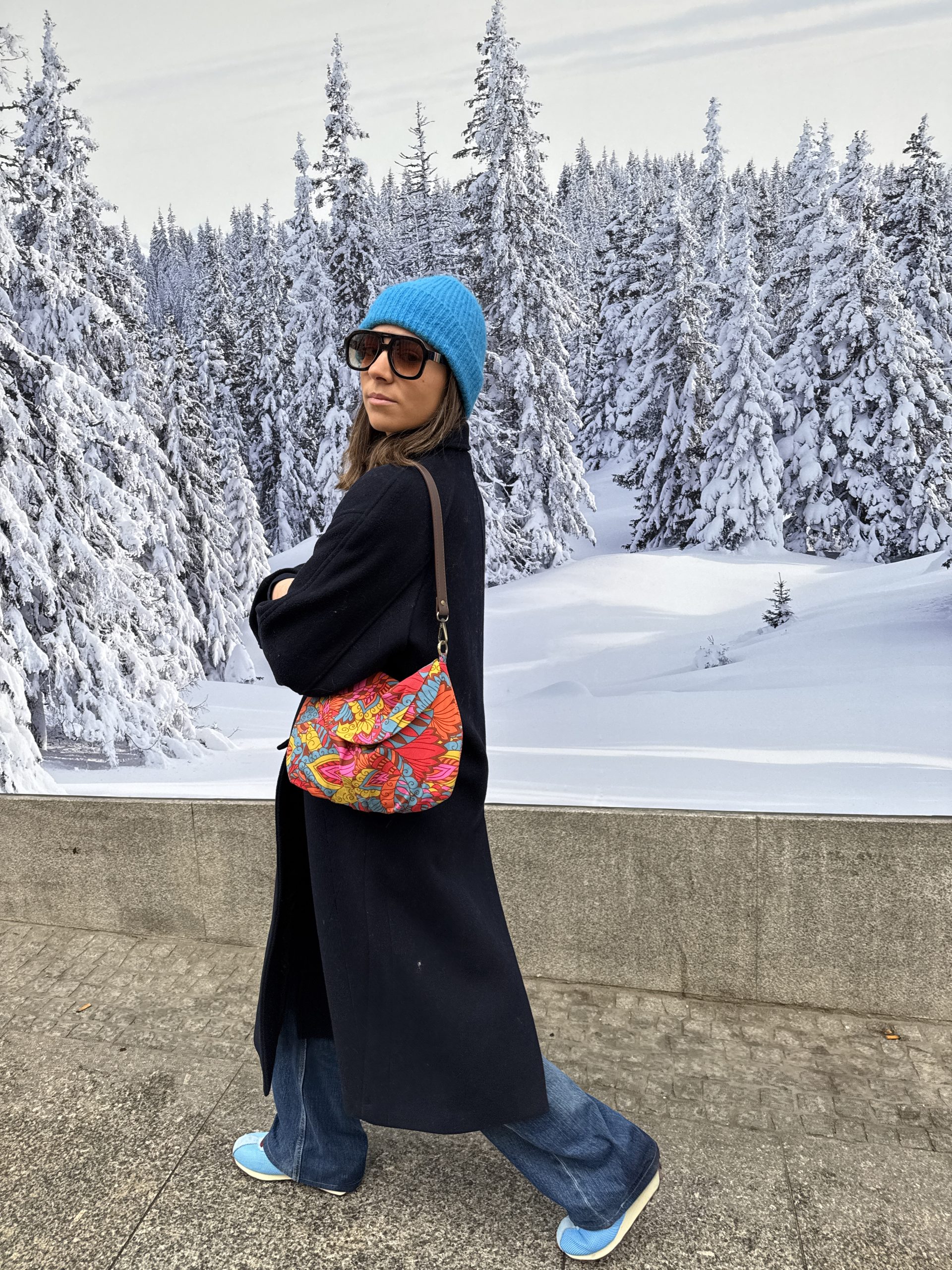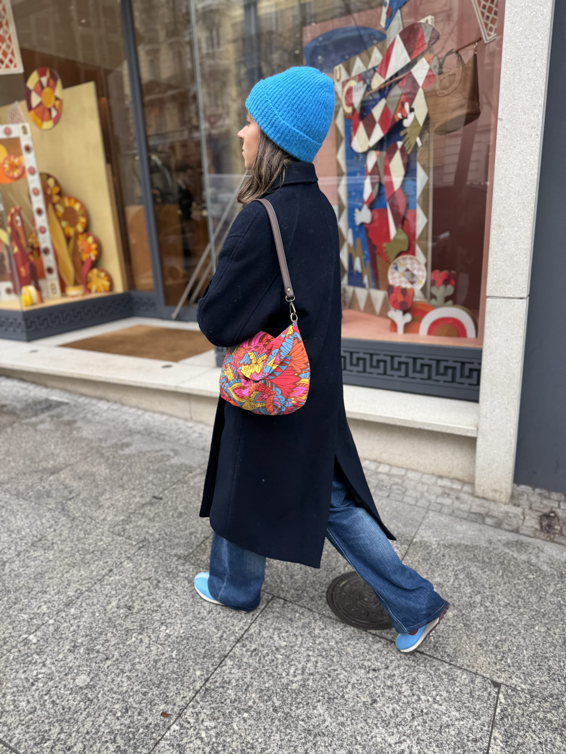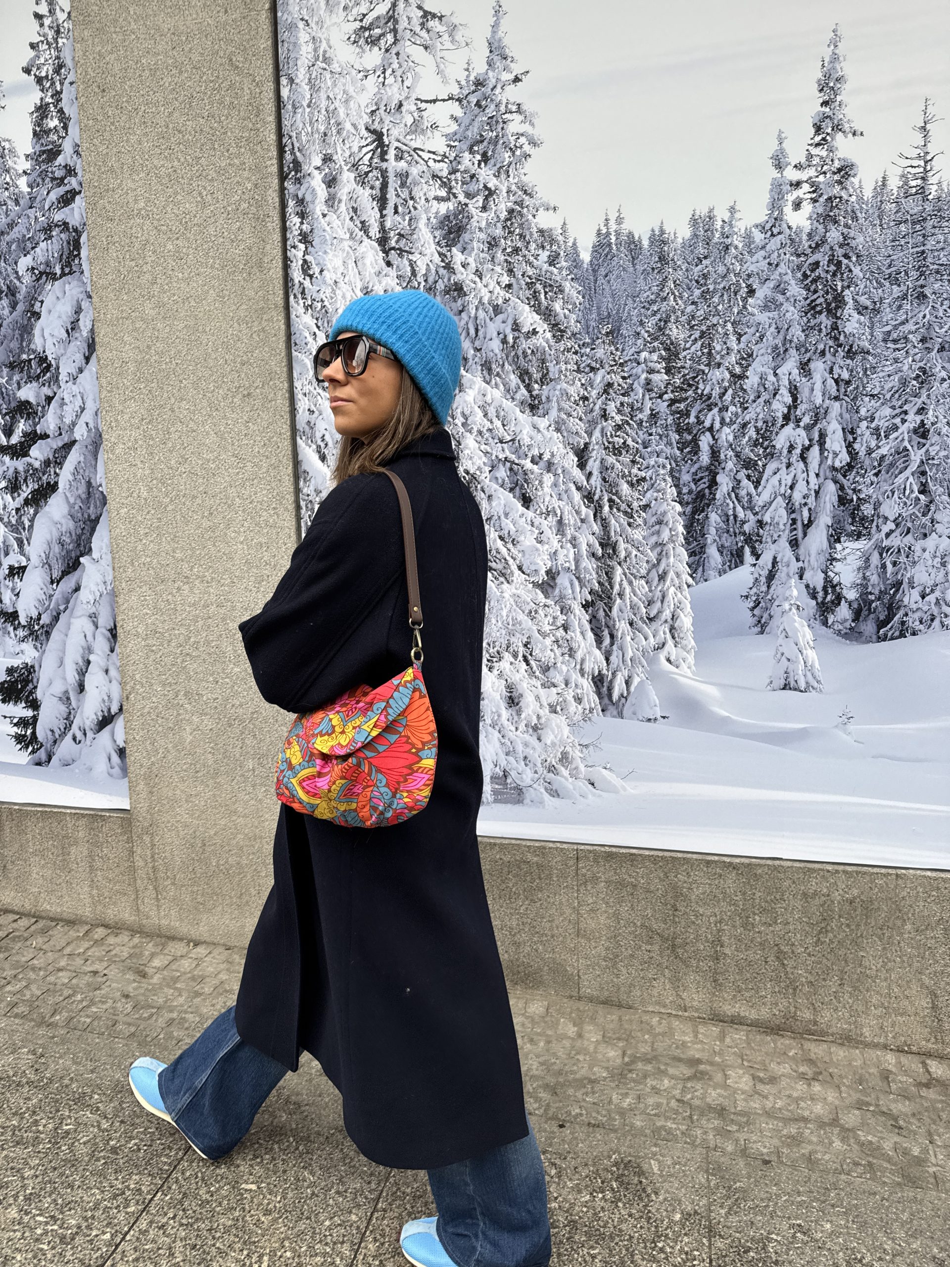 Tela en estampado floral psicodélico y colorido, en tonos brillantes y una mezcla de flores, cierre con una automatizo en la solapa, forrado en rayas finas tonos marrones, bolsillo interior.