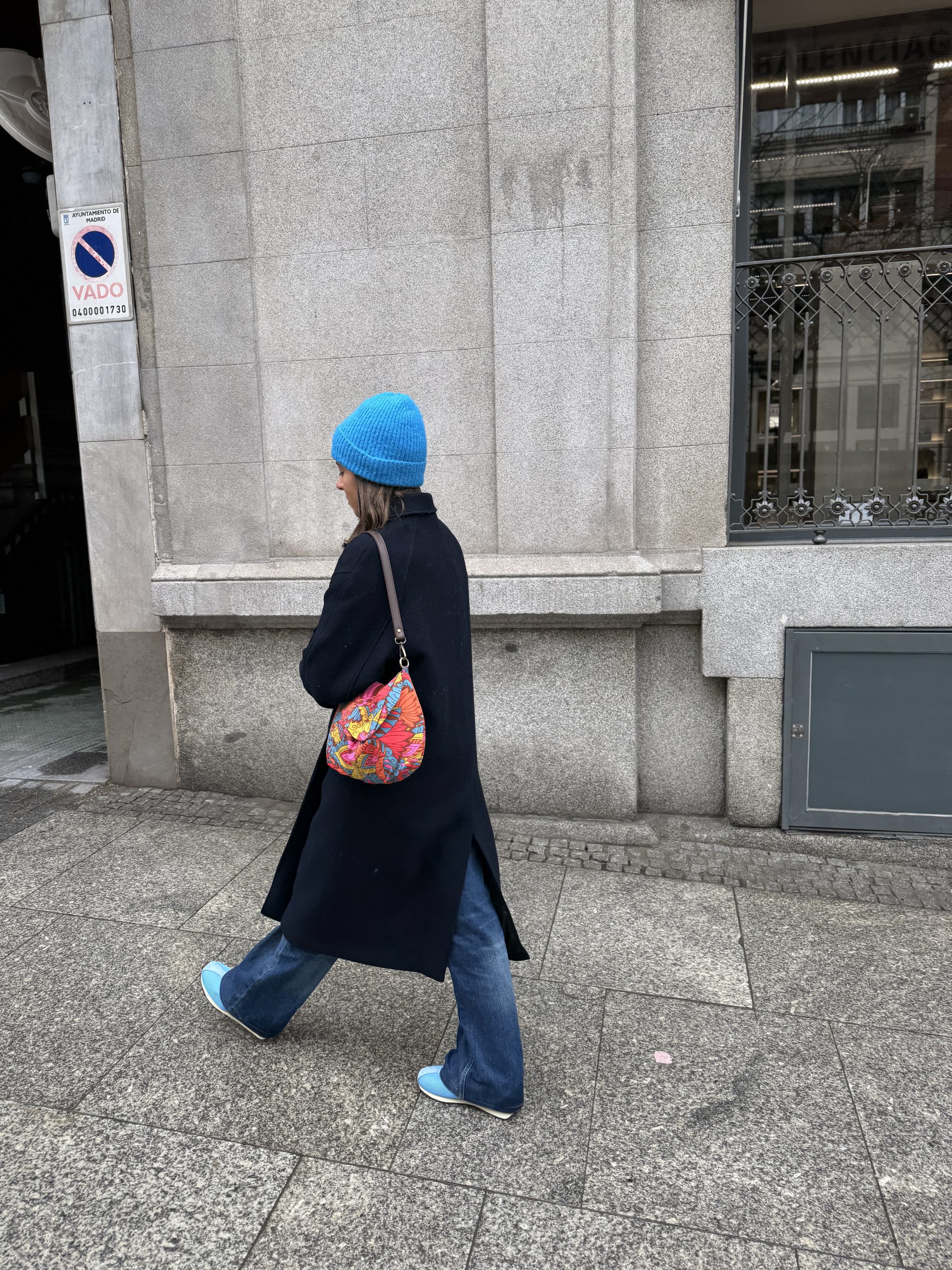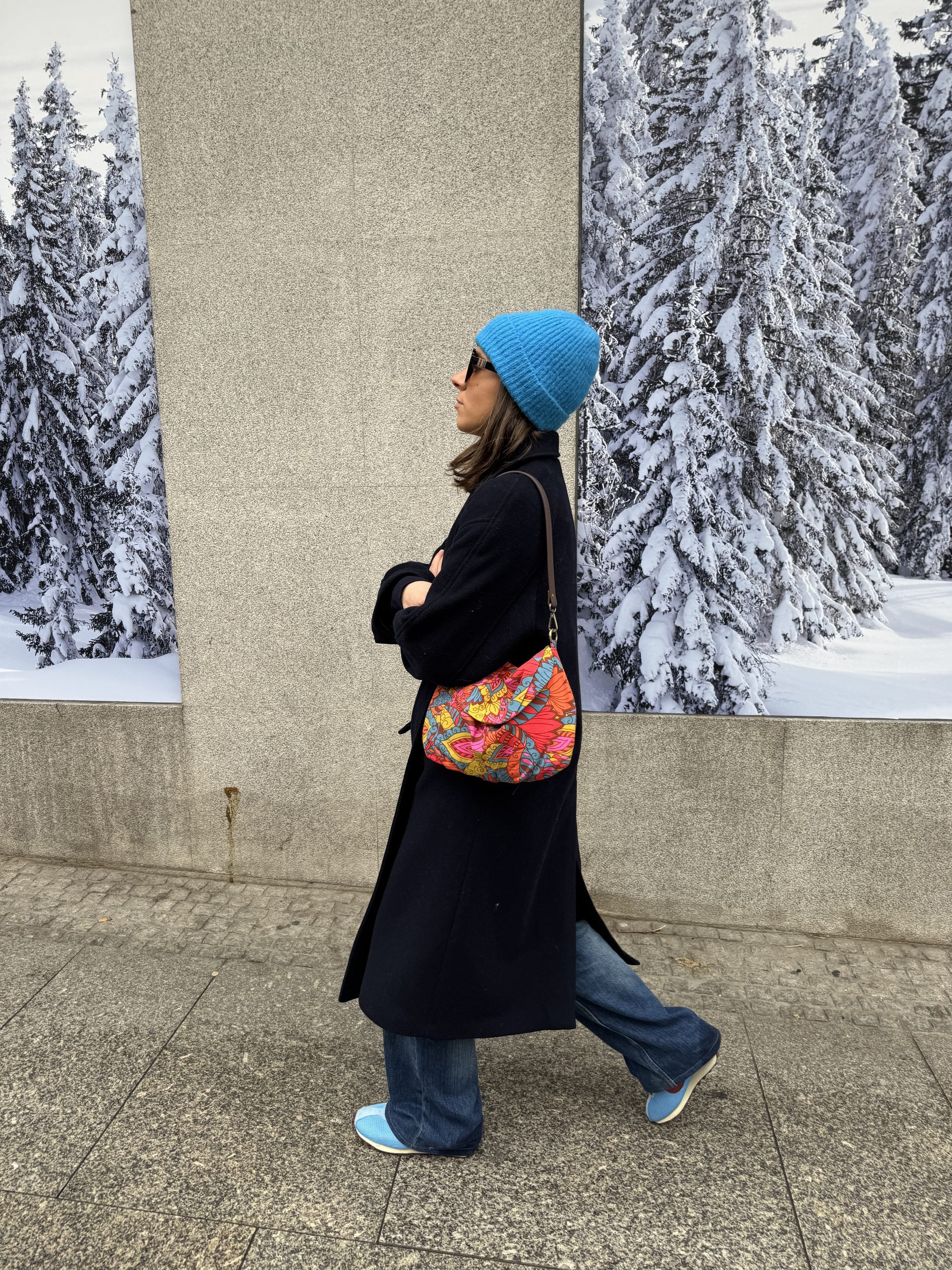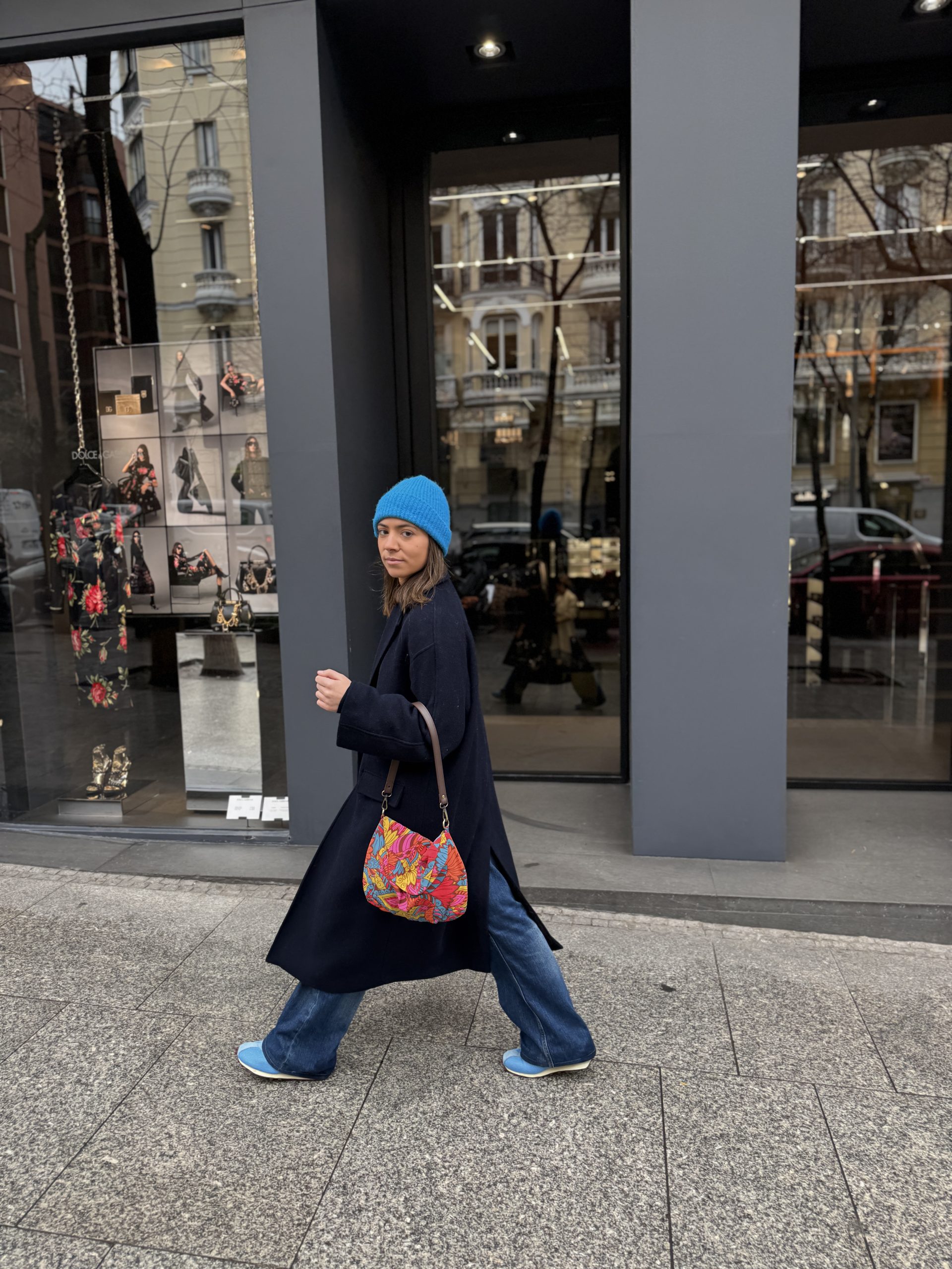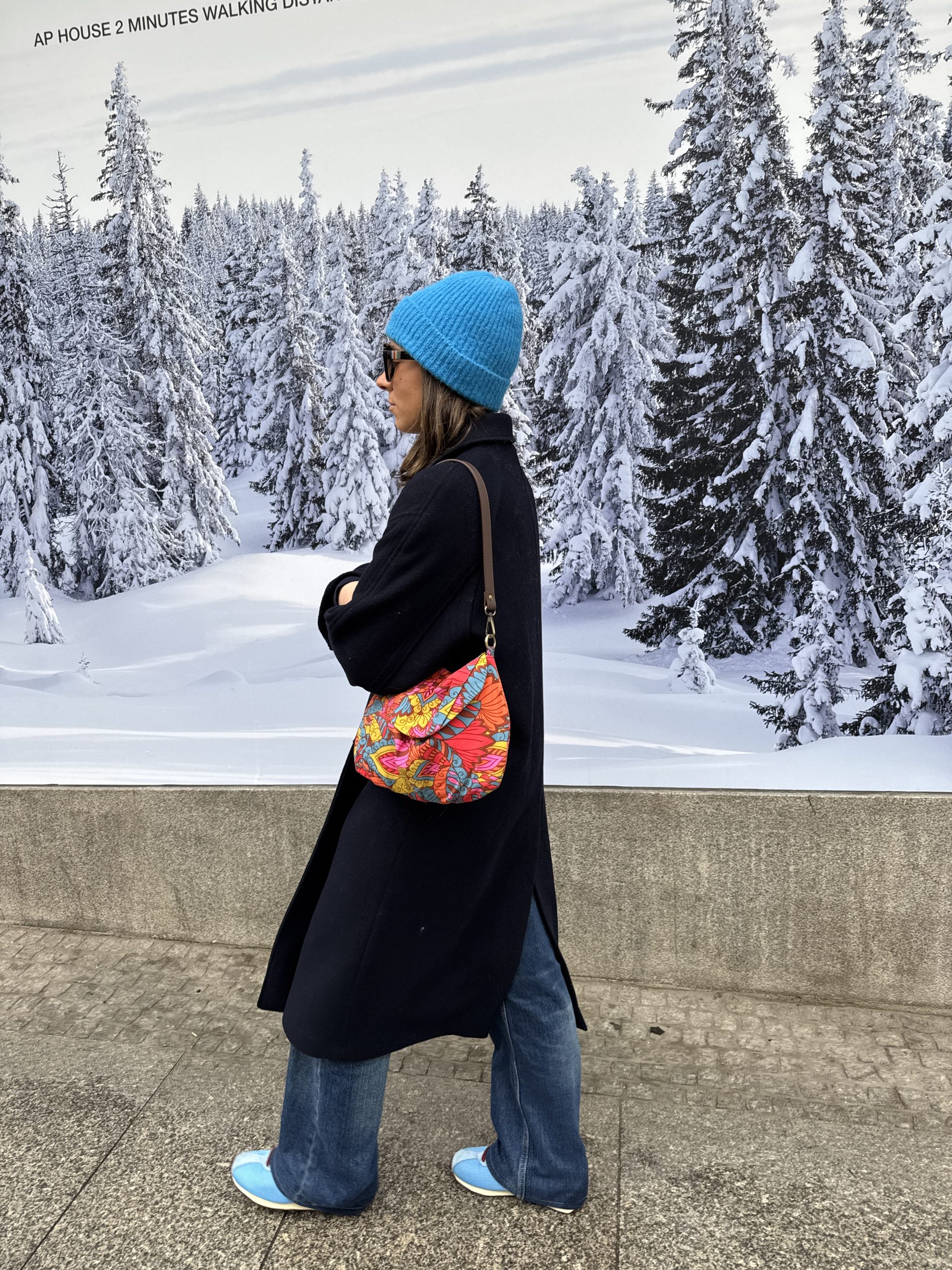 Tela en estampado floral psicodélico y colorido, en tonos brillantes y una mezcla de flores, cierre con una automatizo en la solapa, forrado en rayas finas tonos marrones, bolsillo interior.