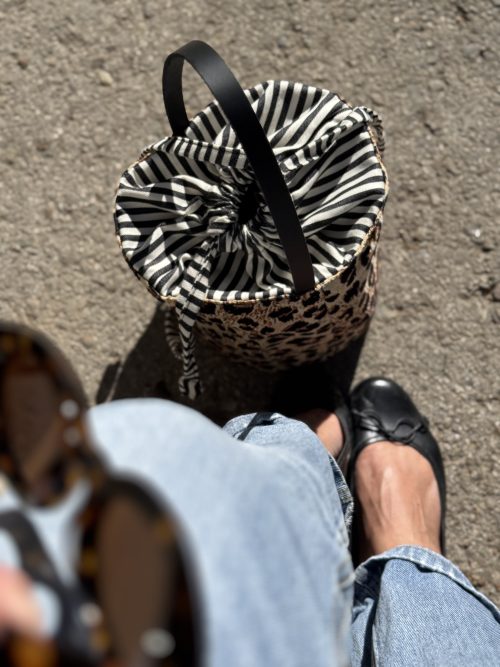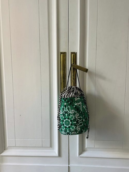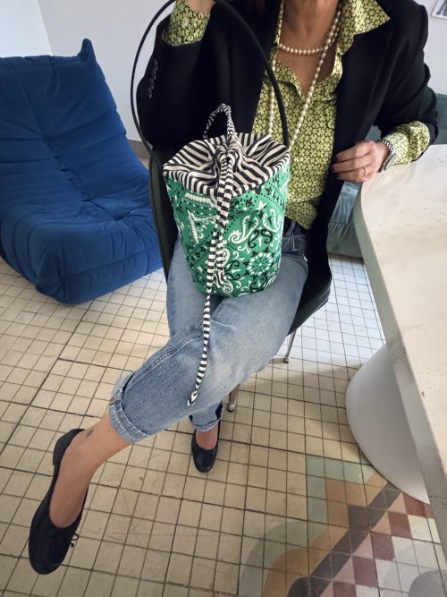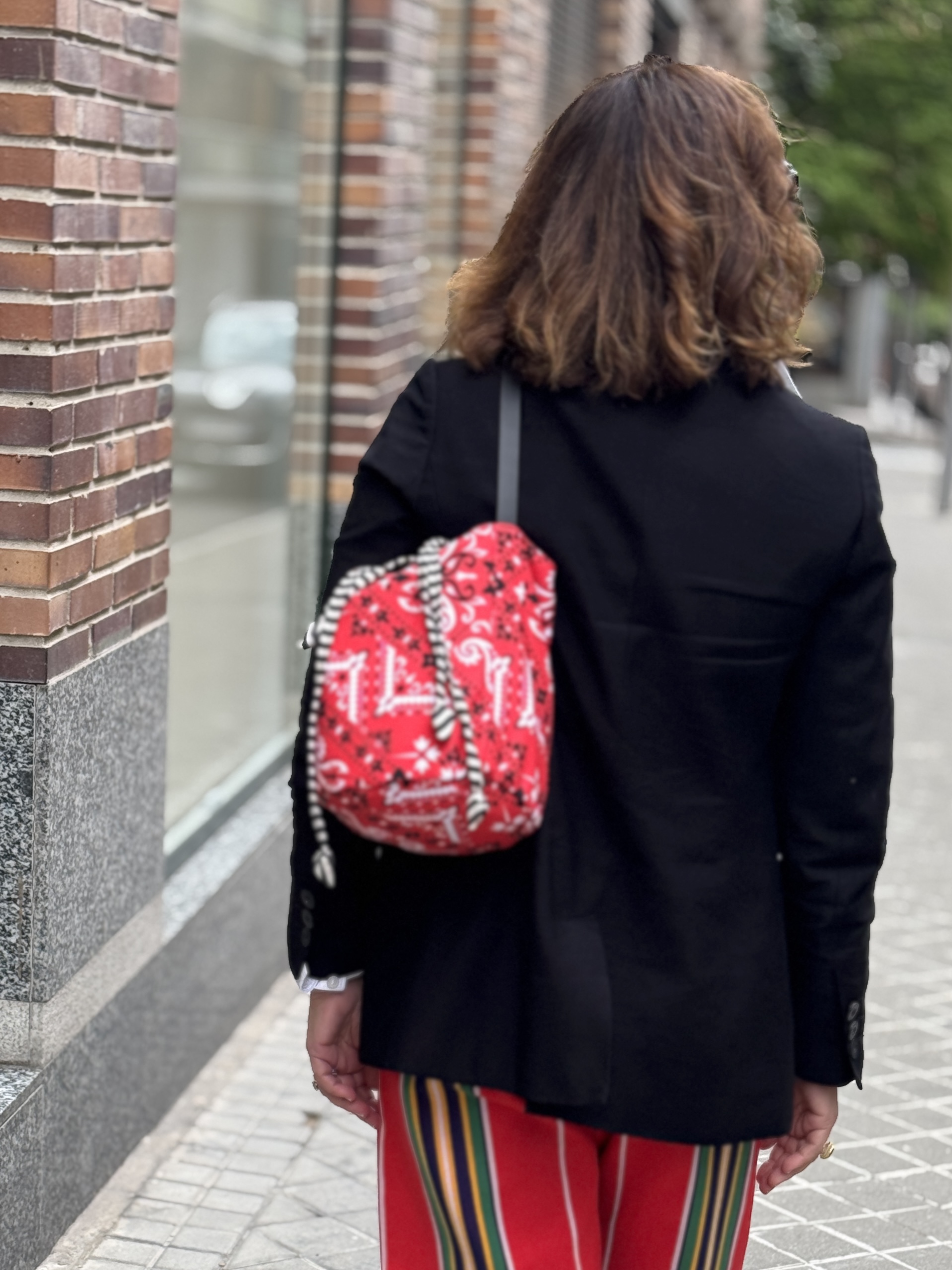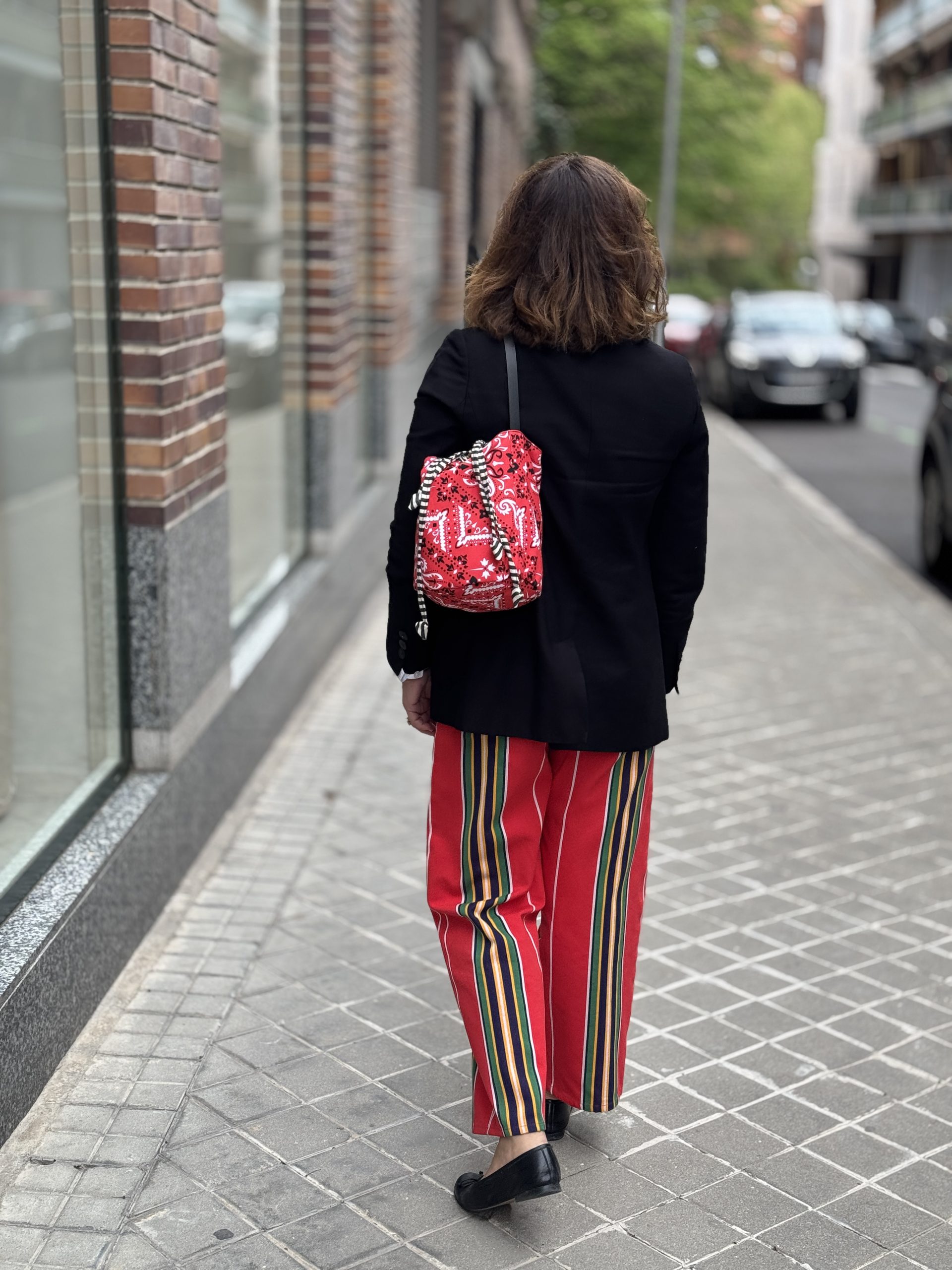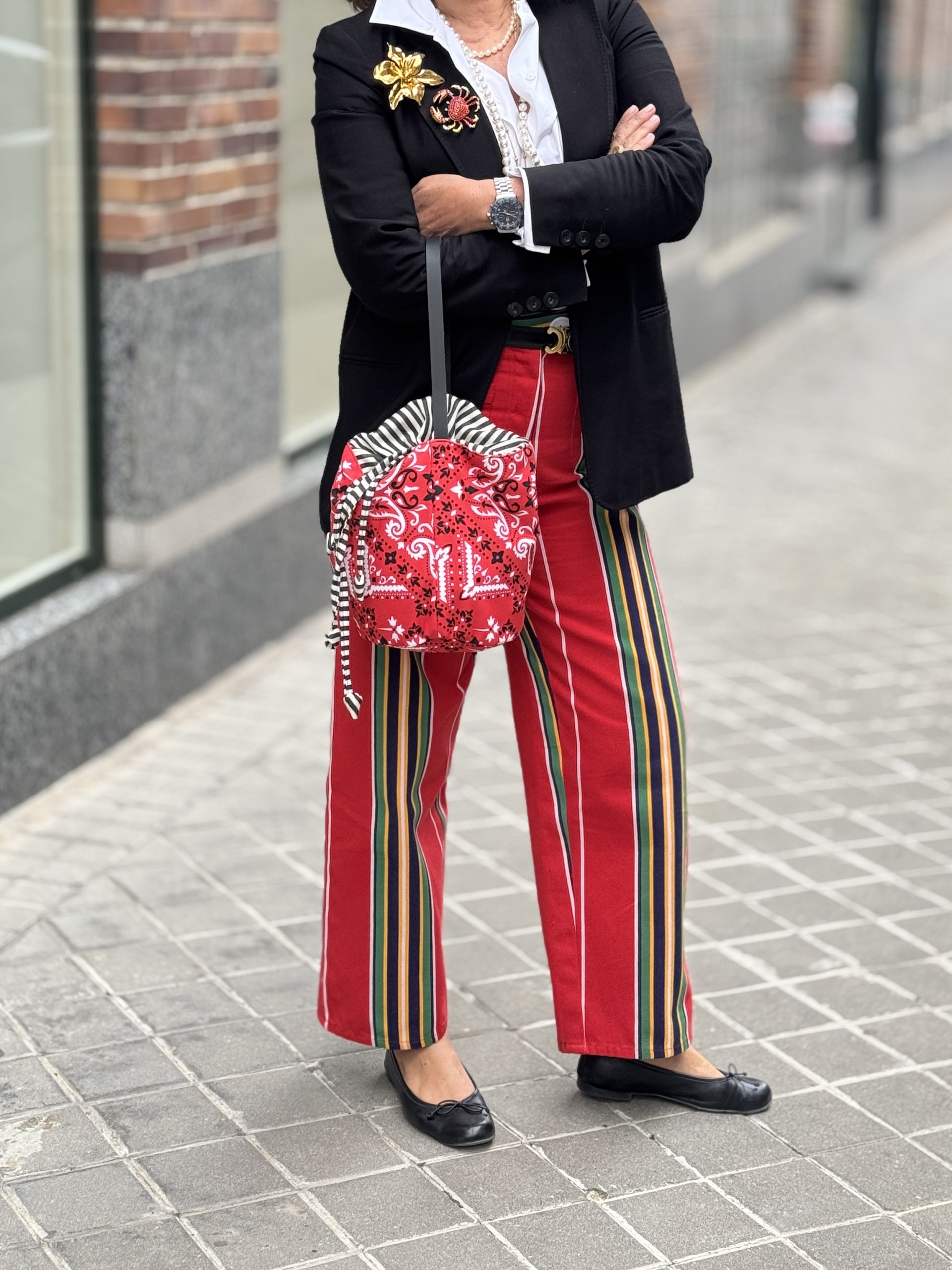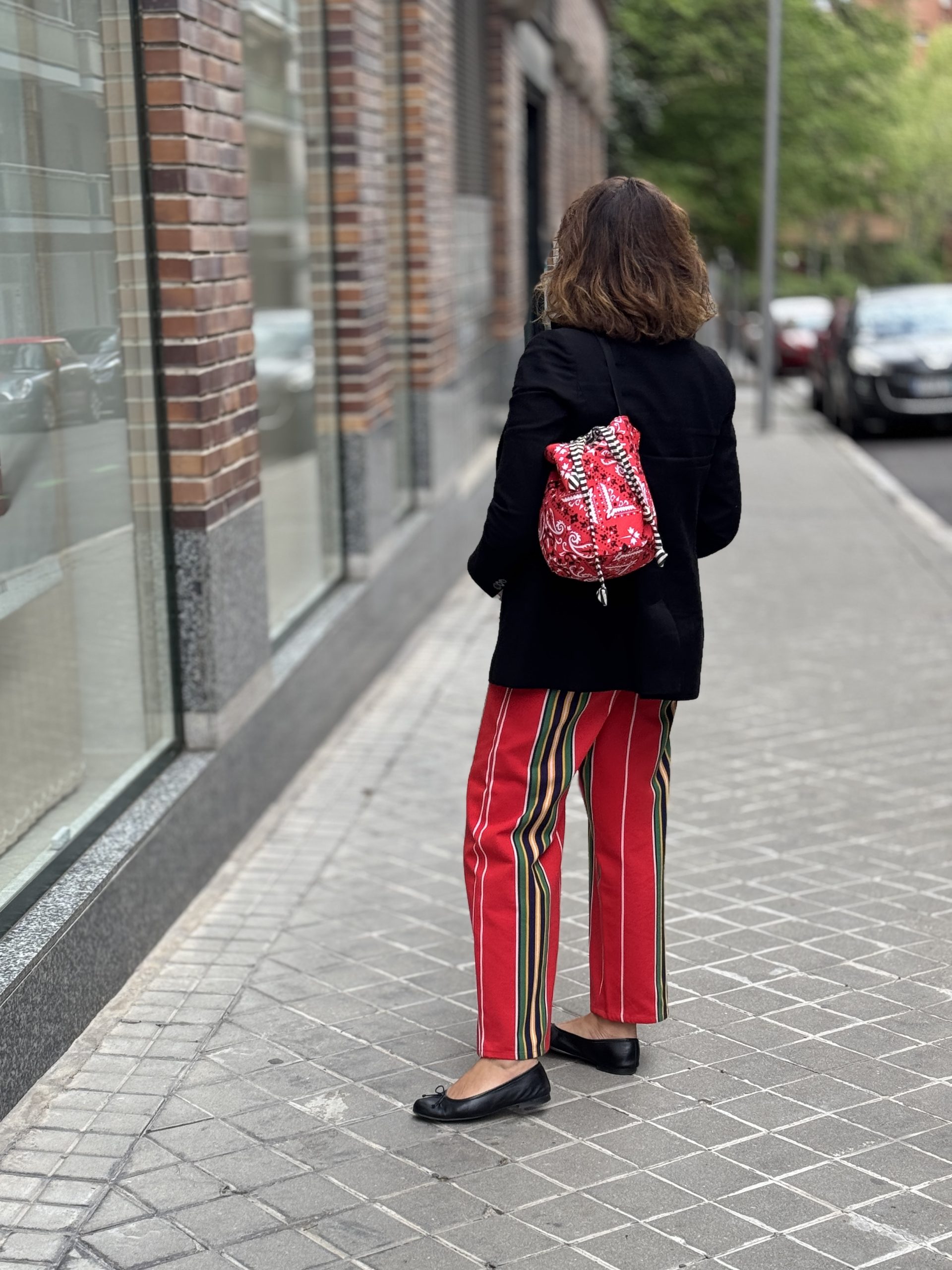 Tela bandana en color rojo algodón 100 x 100, forro rayas blanco y negro algodón 100 x 100, bolsillo interior.