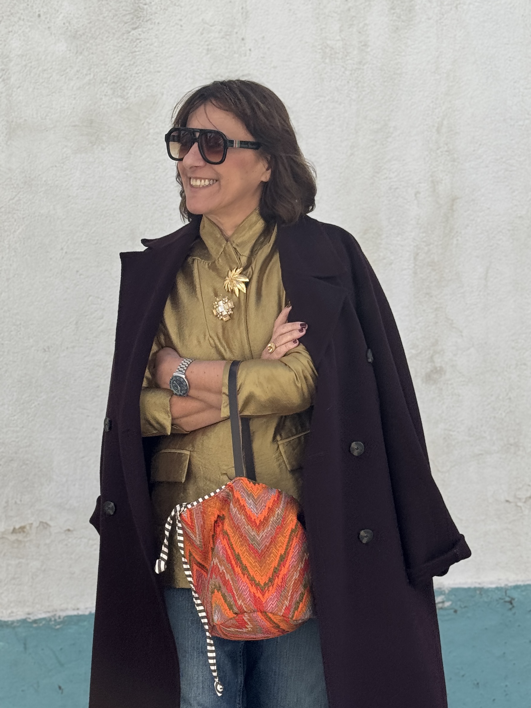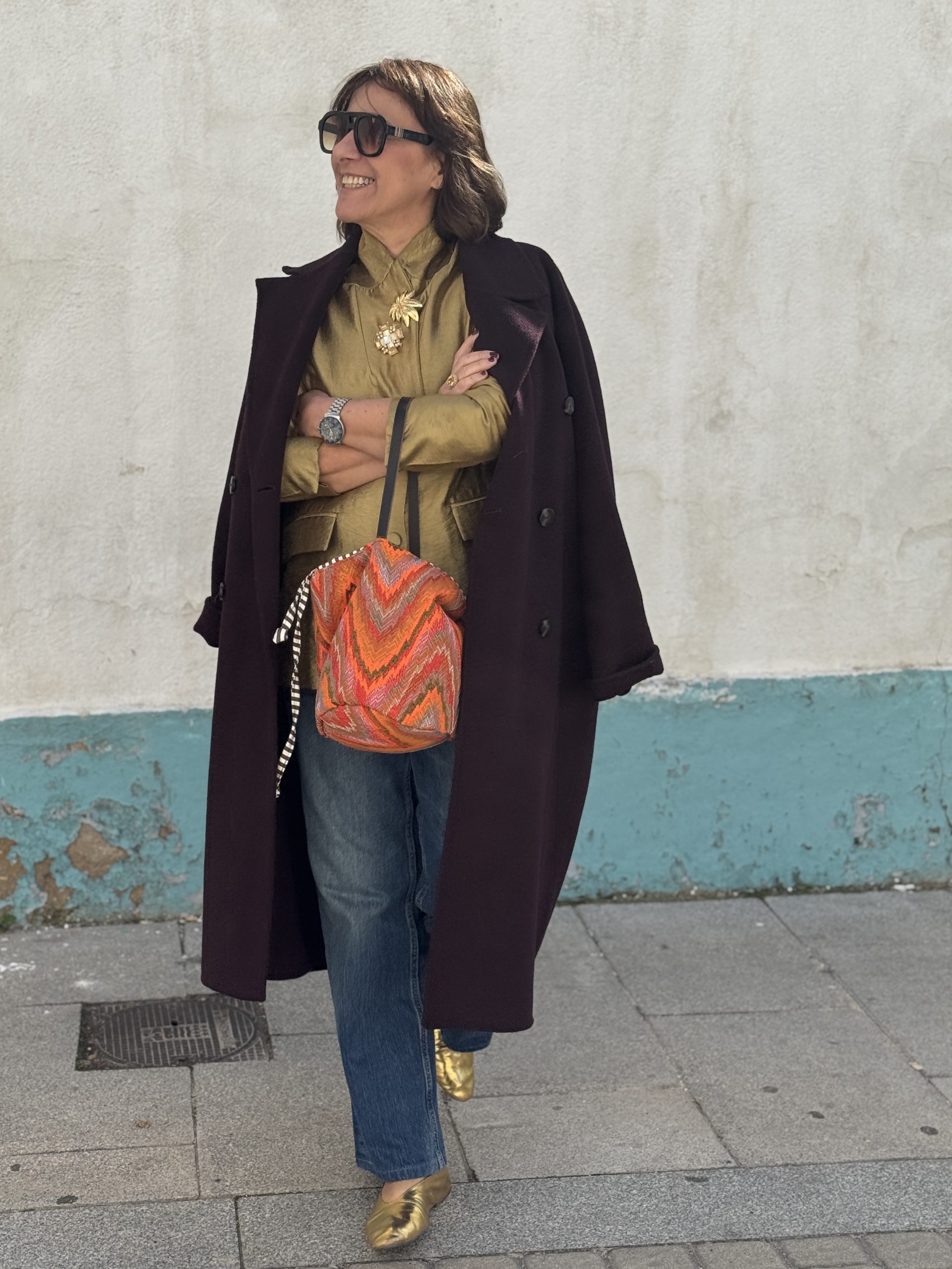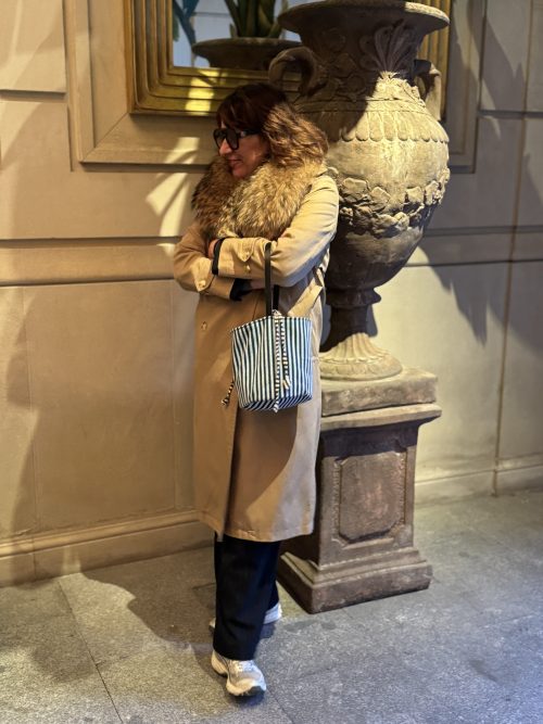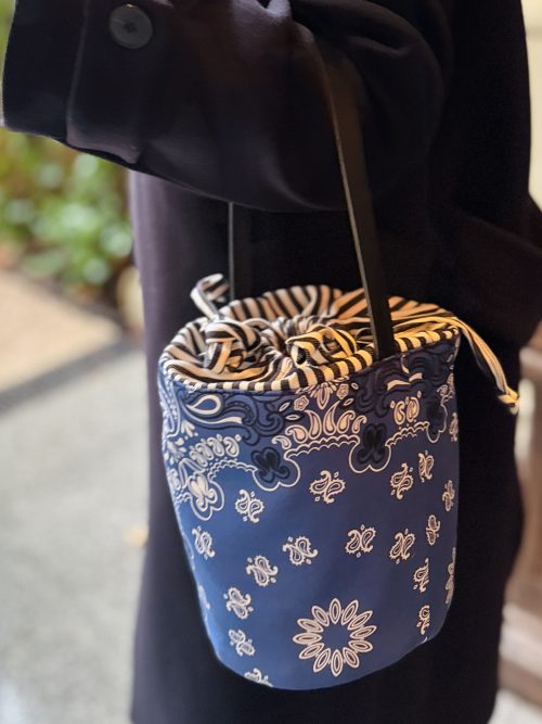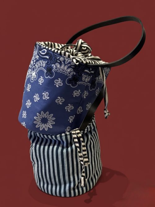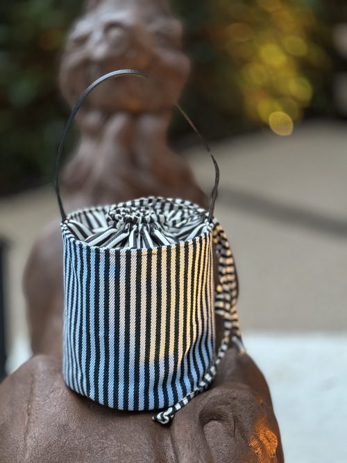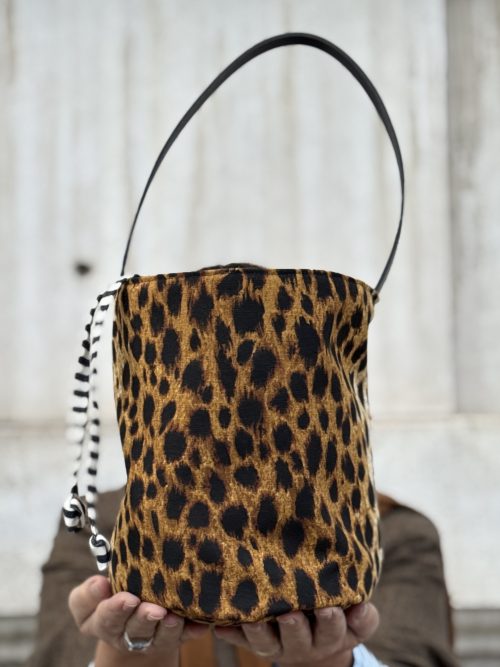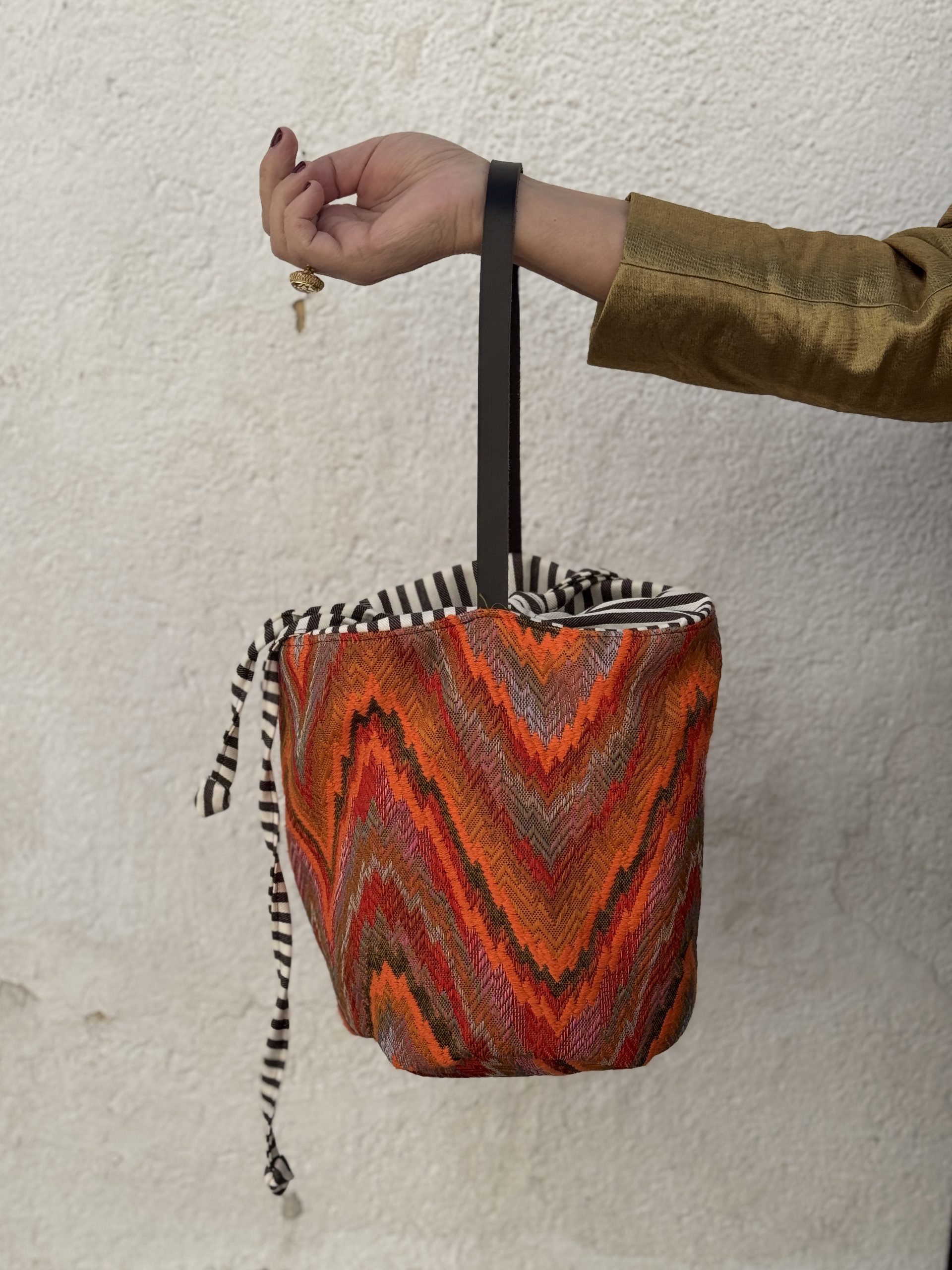 Tejido exterior tejido globelino tipo missoni zip zag en algodón 100×100 colores naranjas, verde, rojo, azul…, forro interior algodón 100×100 rayas blancas y marrones, bolsillo interior, cierre con propia tela forro interior.