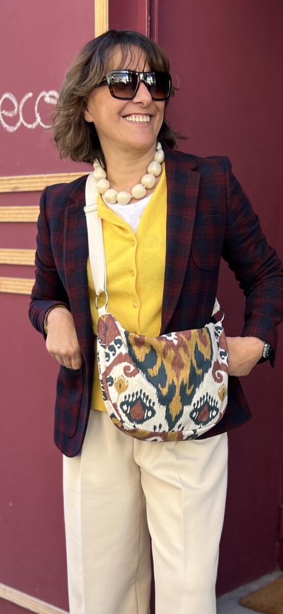 Tela algodón estampado, forro crudo algodón 100 x 100, bolsillo interior, cremallera color cruda y cinta de algodón color crudo. Lleva unas anillas metálicas (no pesan) en los laterales.