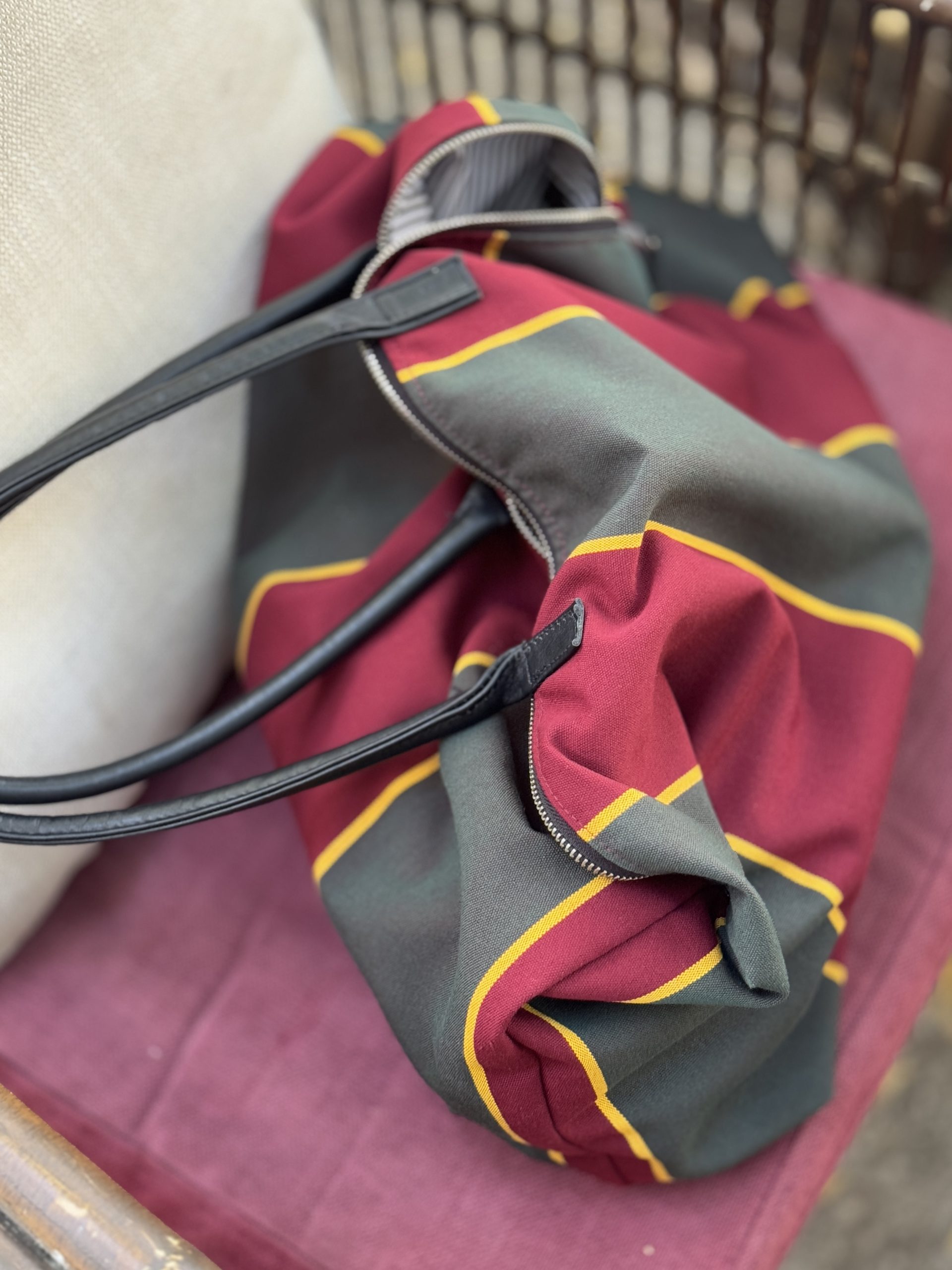 Tela de Rayas 60% acrílico 40% poliéster, forro rayas negras y blancas, cremallera diente metálico en plata, bolsillo interior.