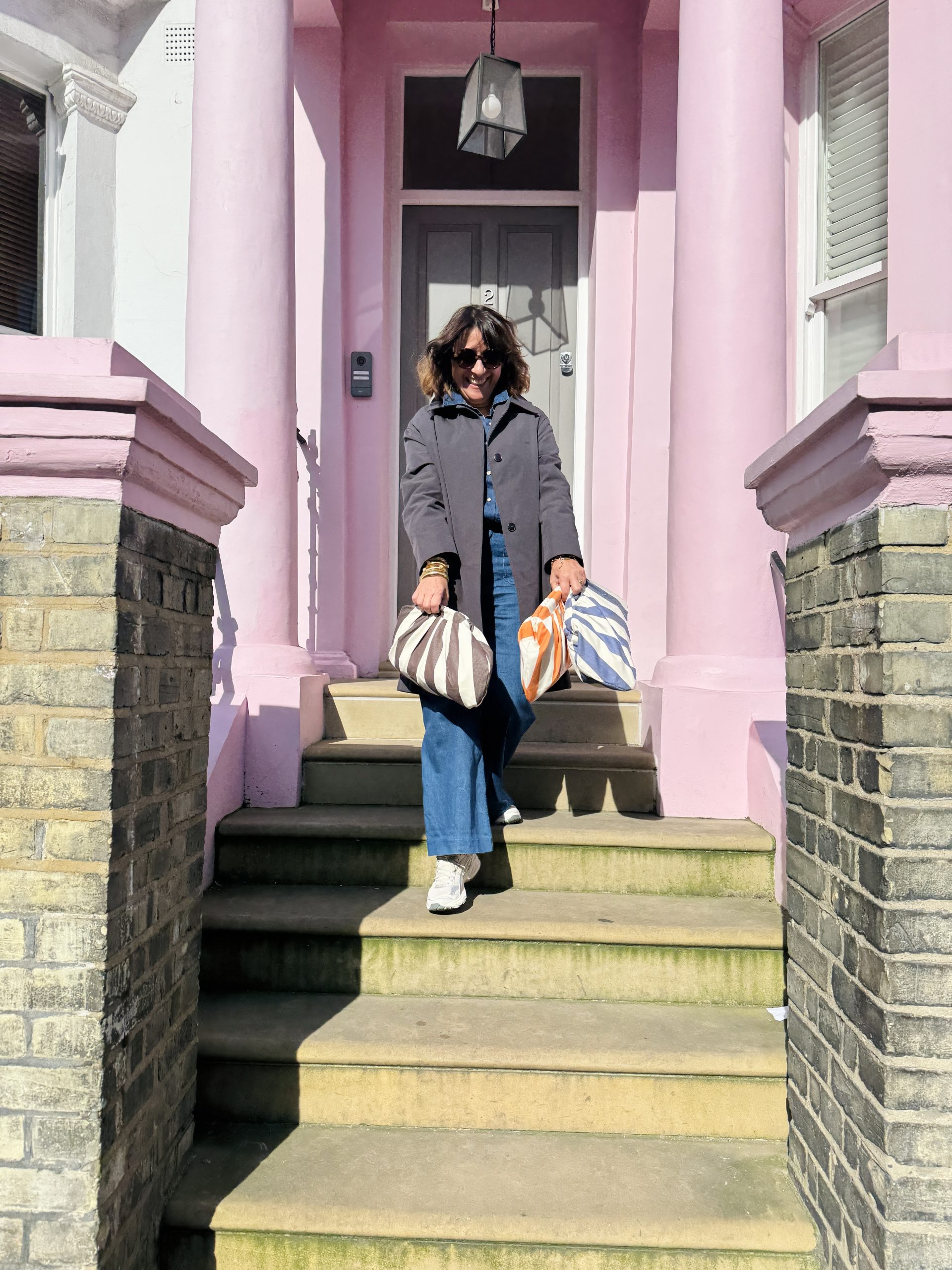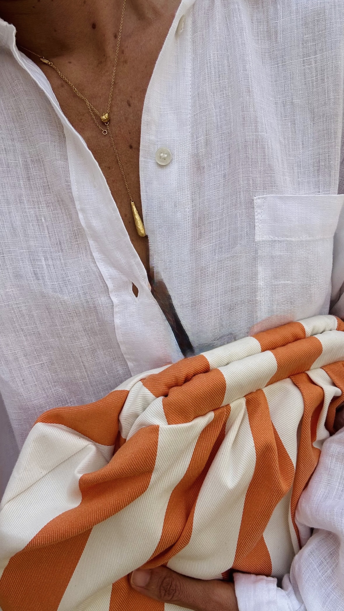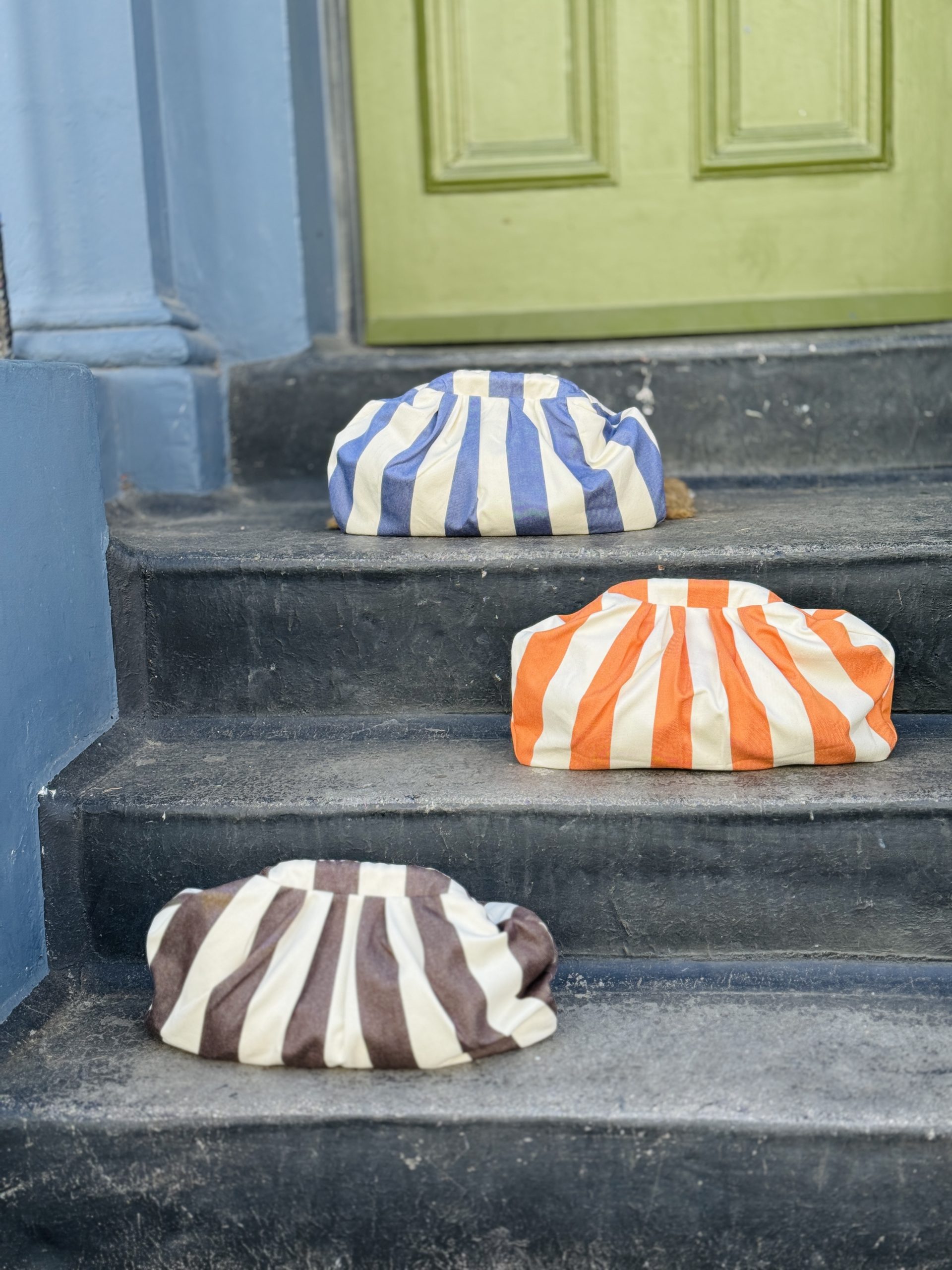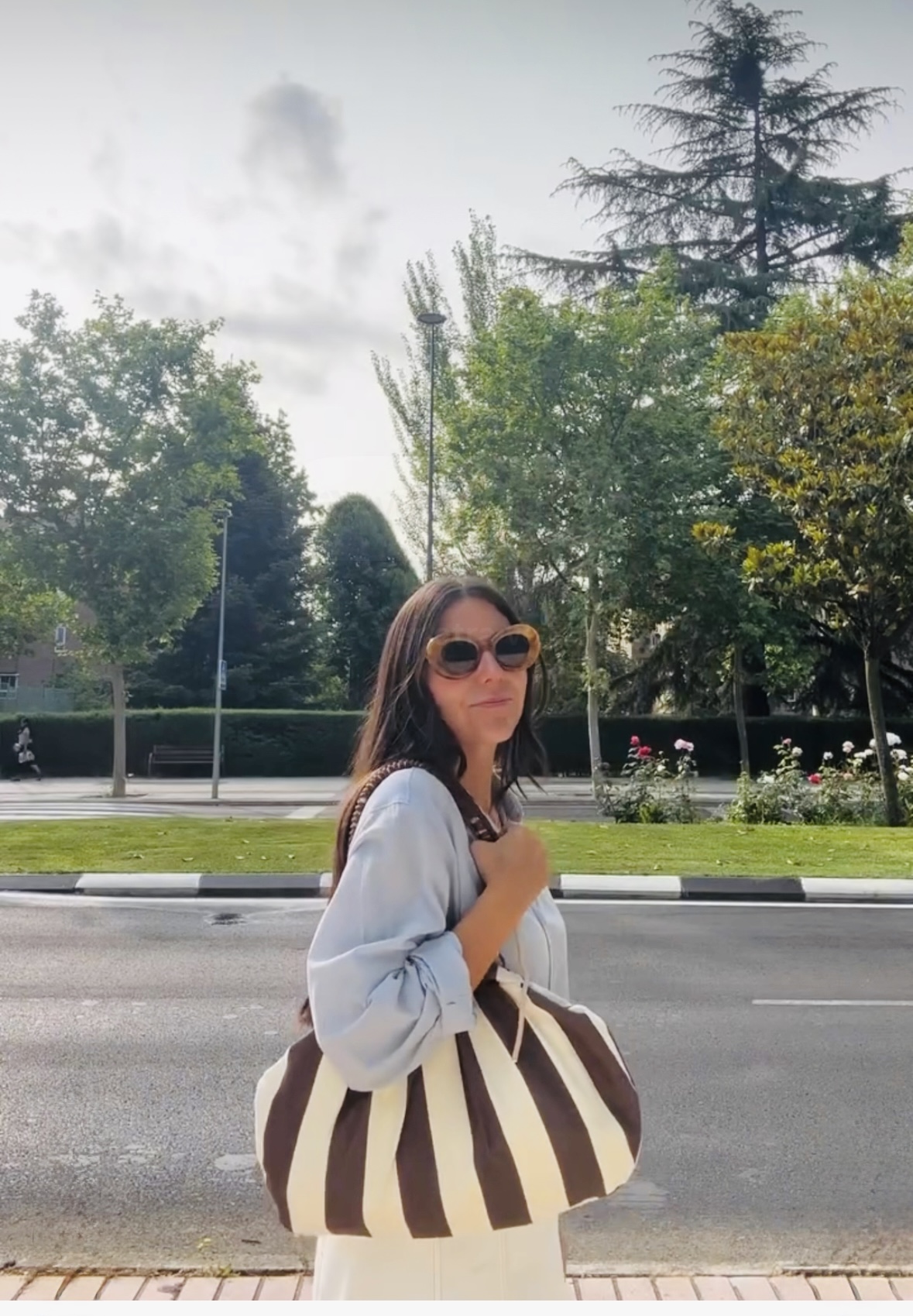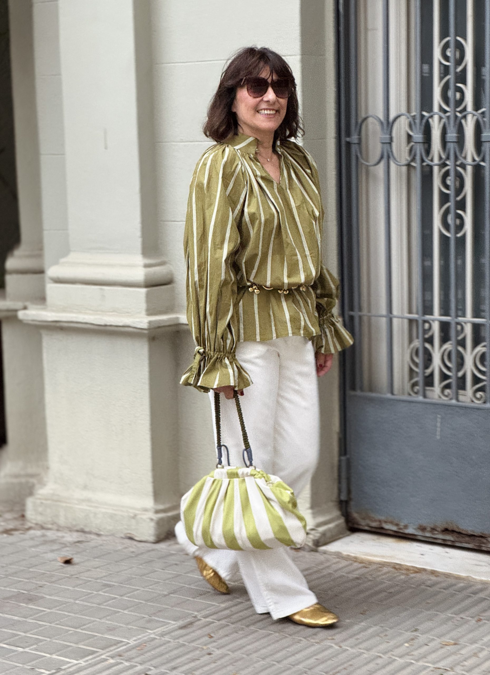 Tela Rayas Anchas algodón 100×100, forro grueso de algodón color marfil, bolsillo interior.
