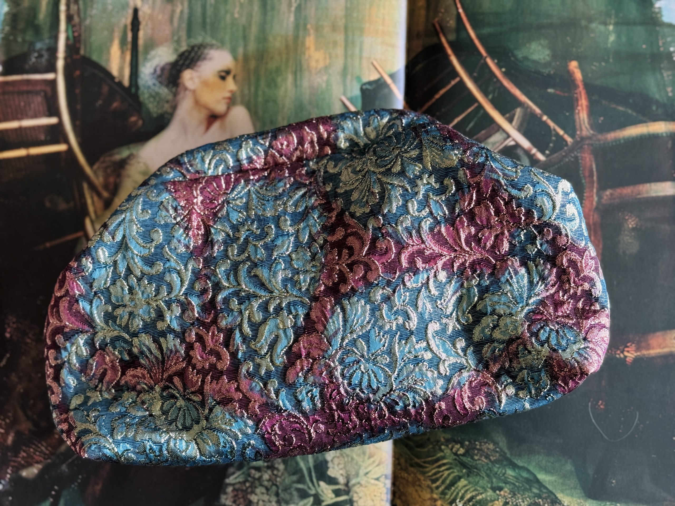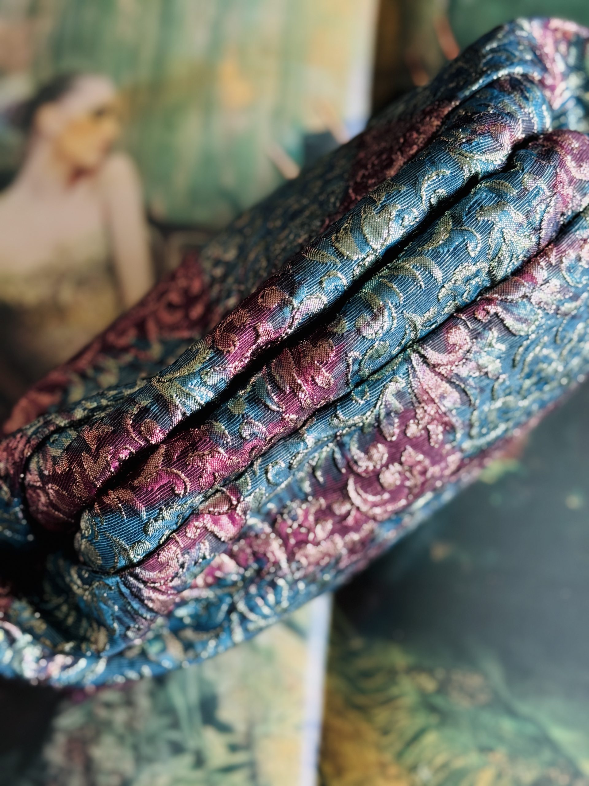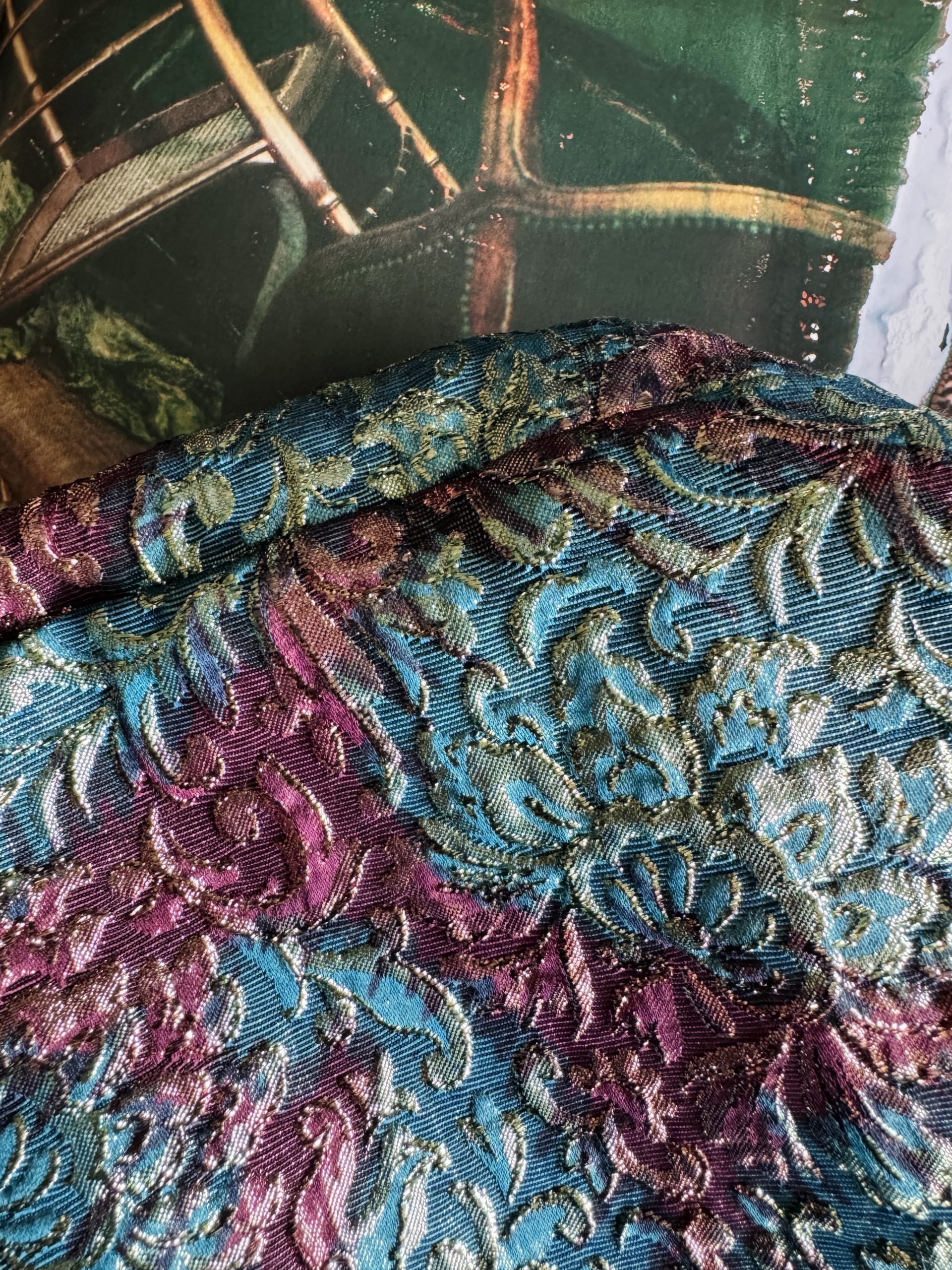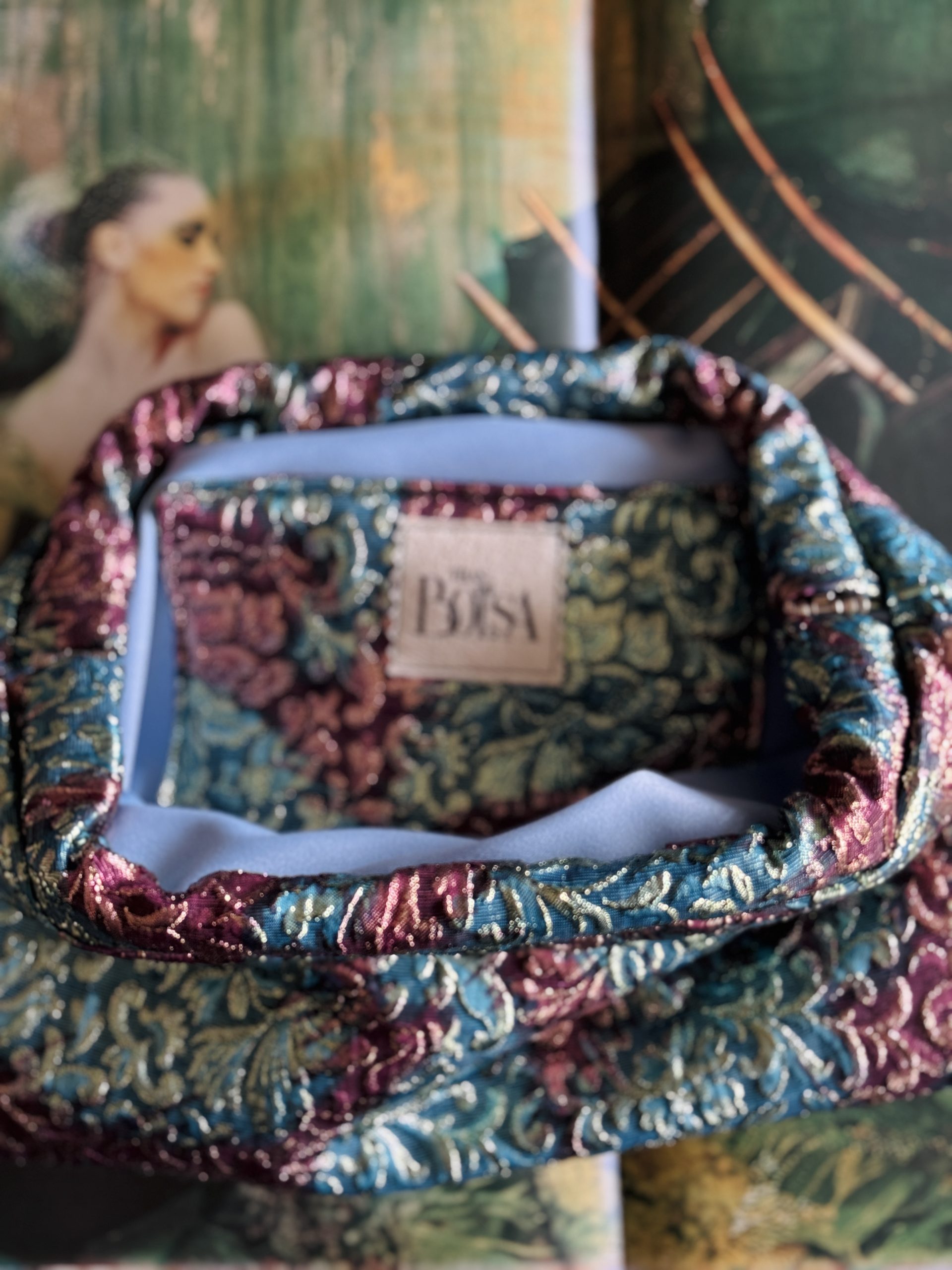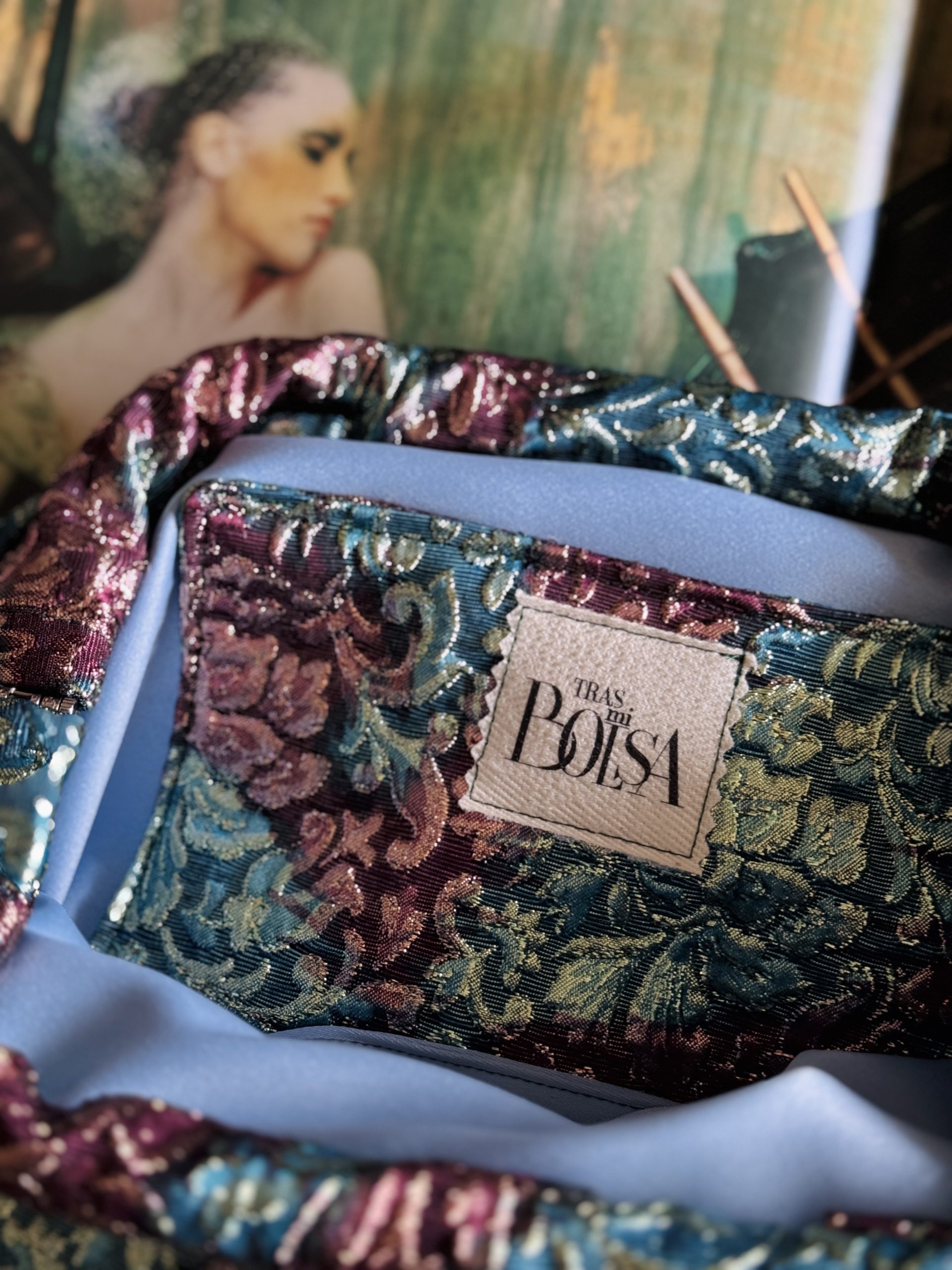 Tela de brocado de seda color azul, verde y oro rosa, forro interior satinado azul oxford, bolsillo interior.