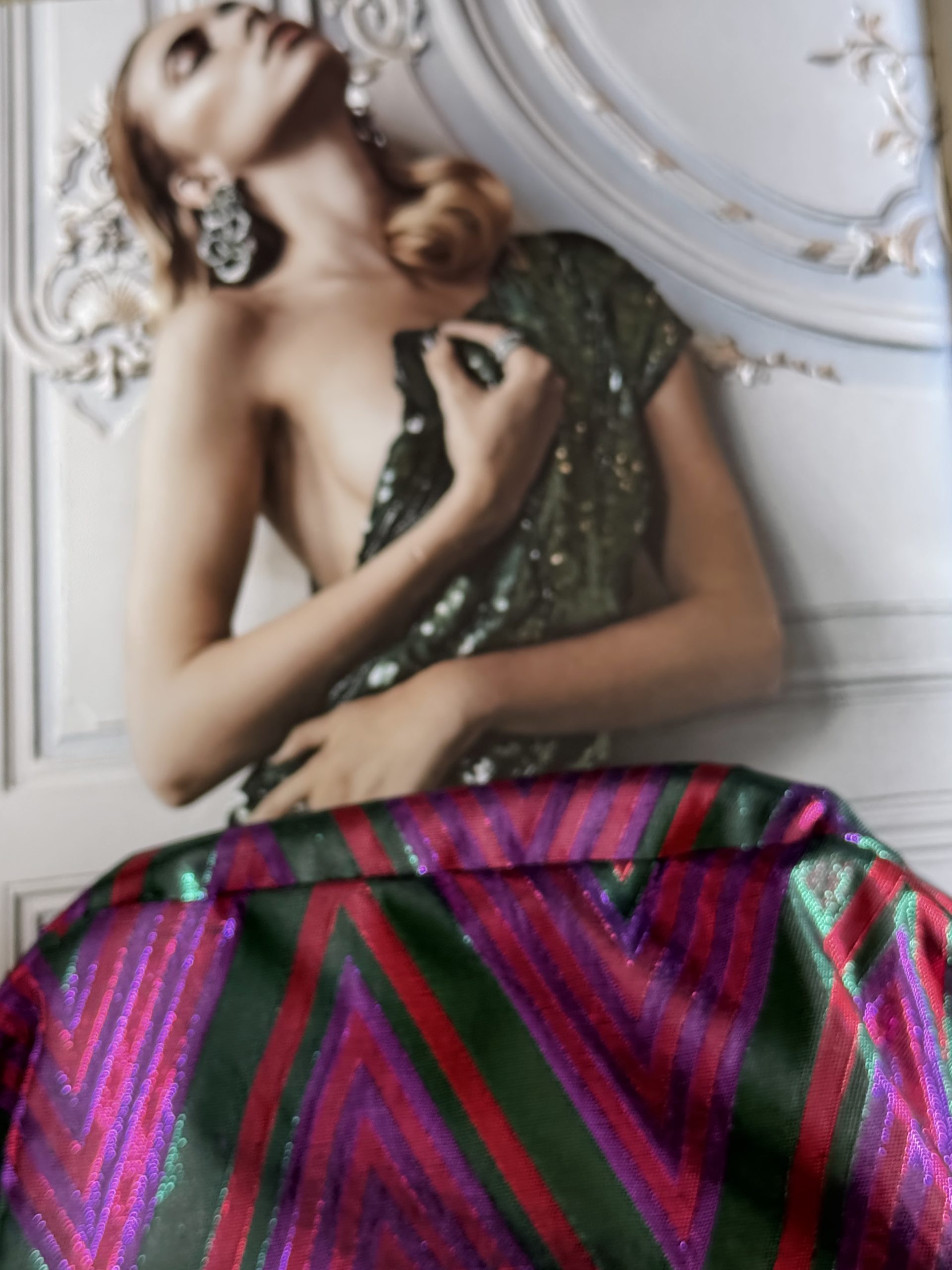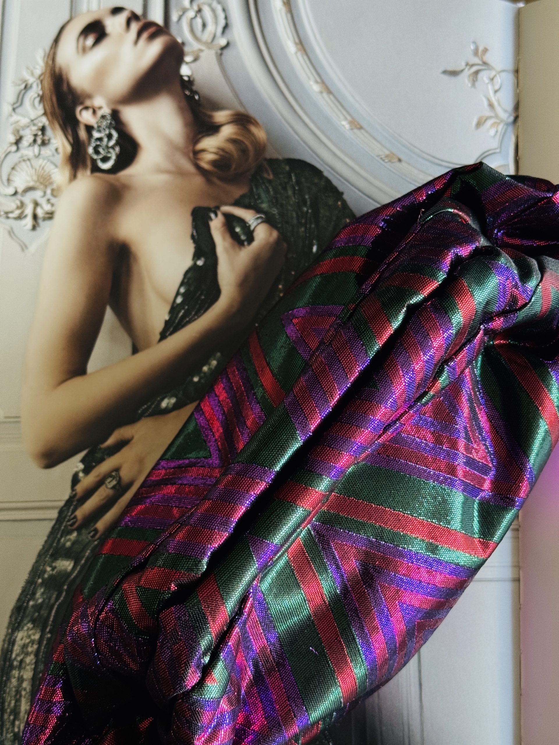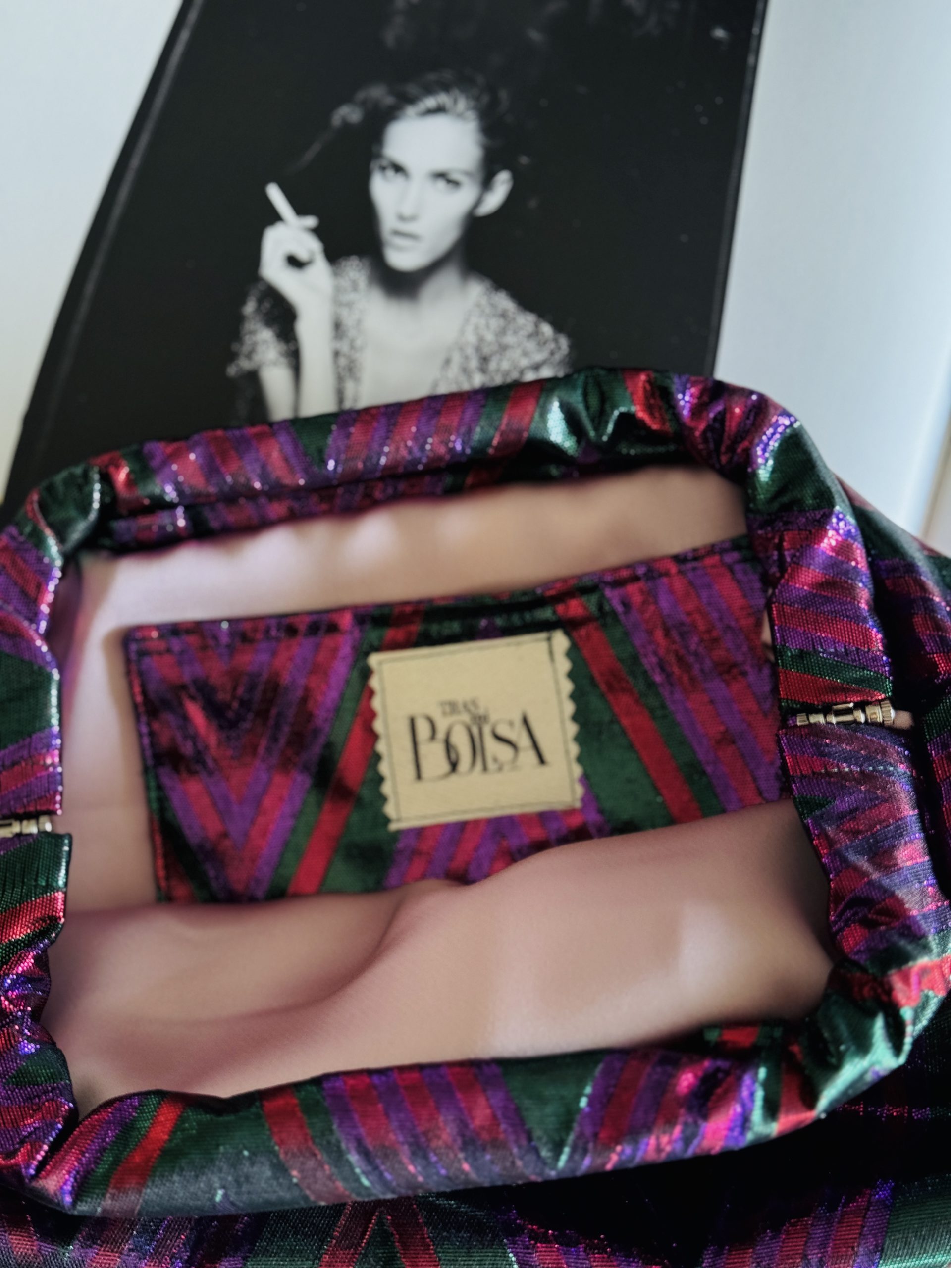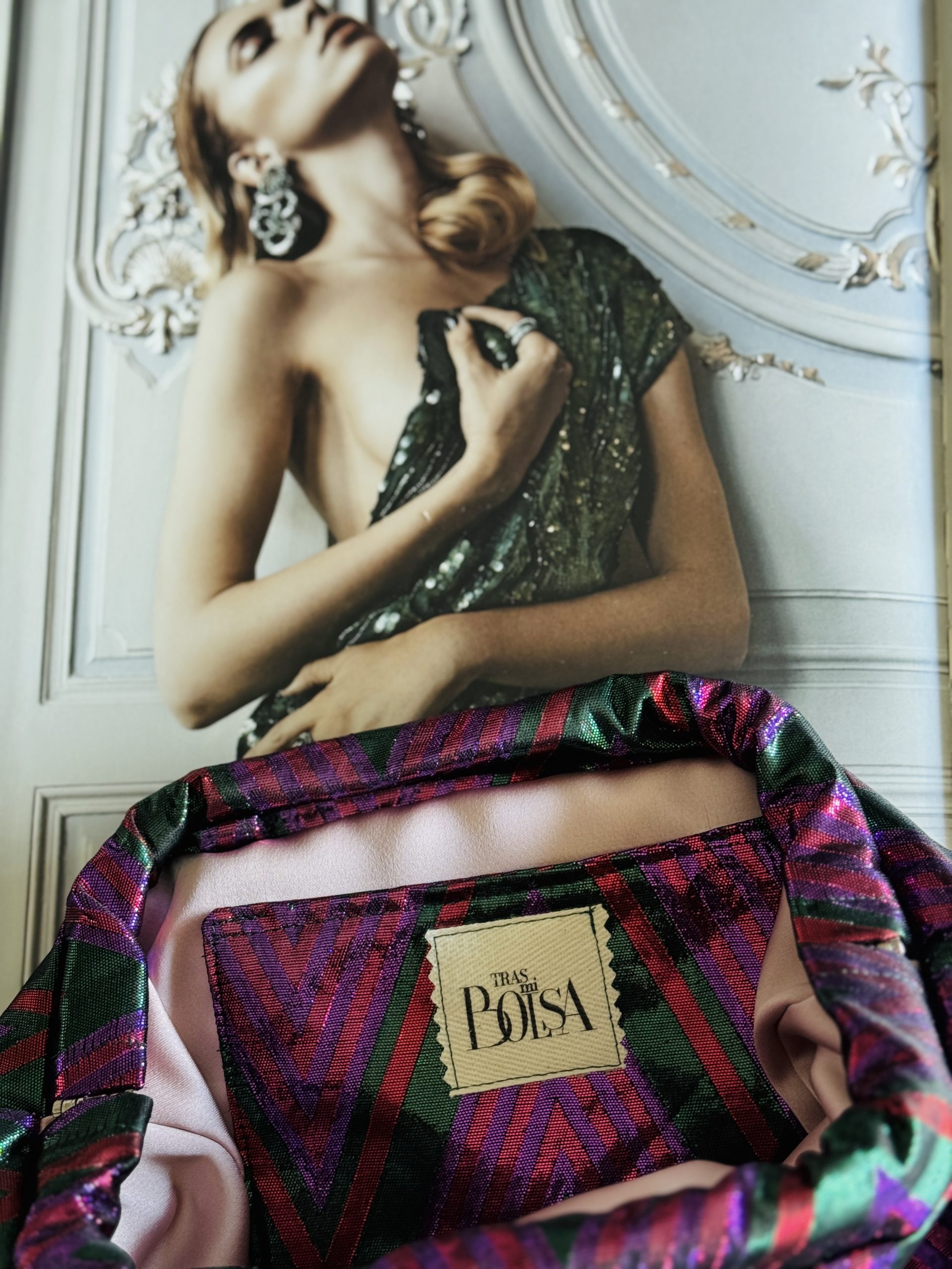 Seda salvaje con entramado metalizado en tonos fucsia y verde, forro satinado en rosa empolvado con bolsillo interior.