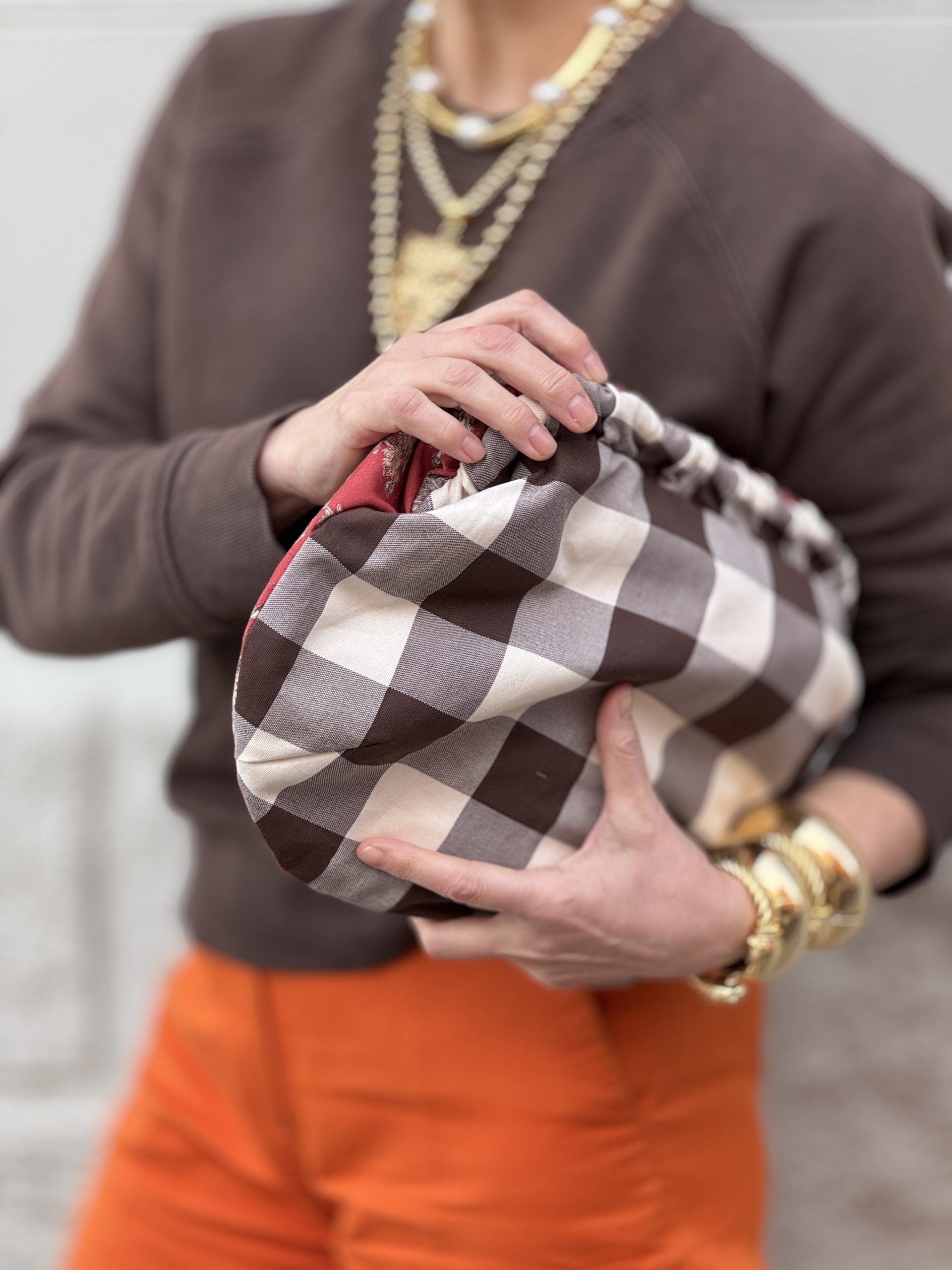 Vichy por un lado y Toile de Jouy por el otro. Ambas en algodón 100 x 100. Forro interior en loneta de algodón crudo con bolsillo interior.