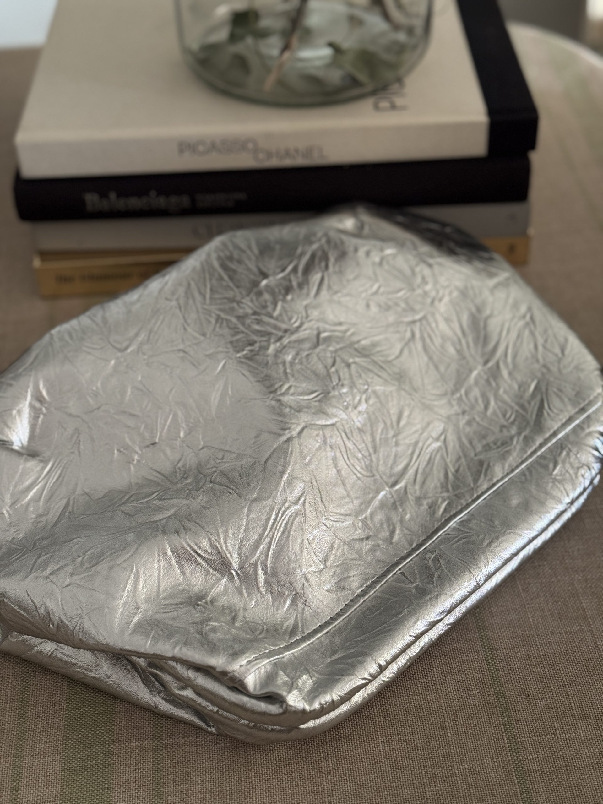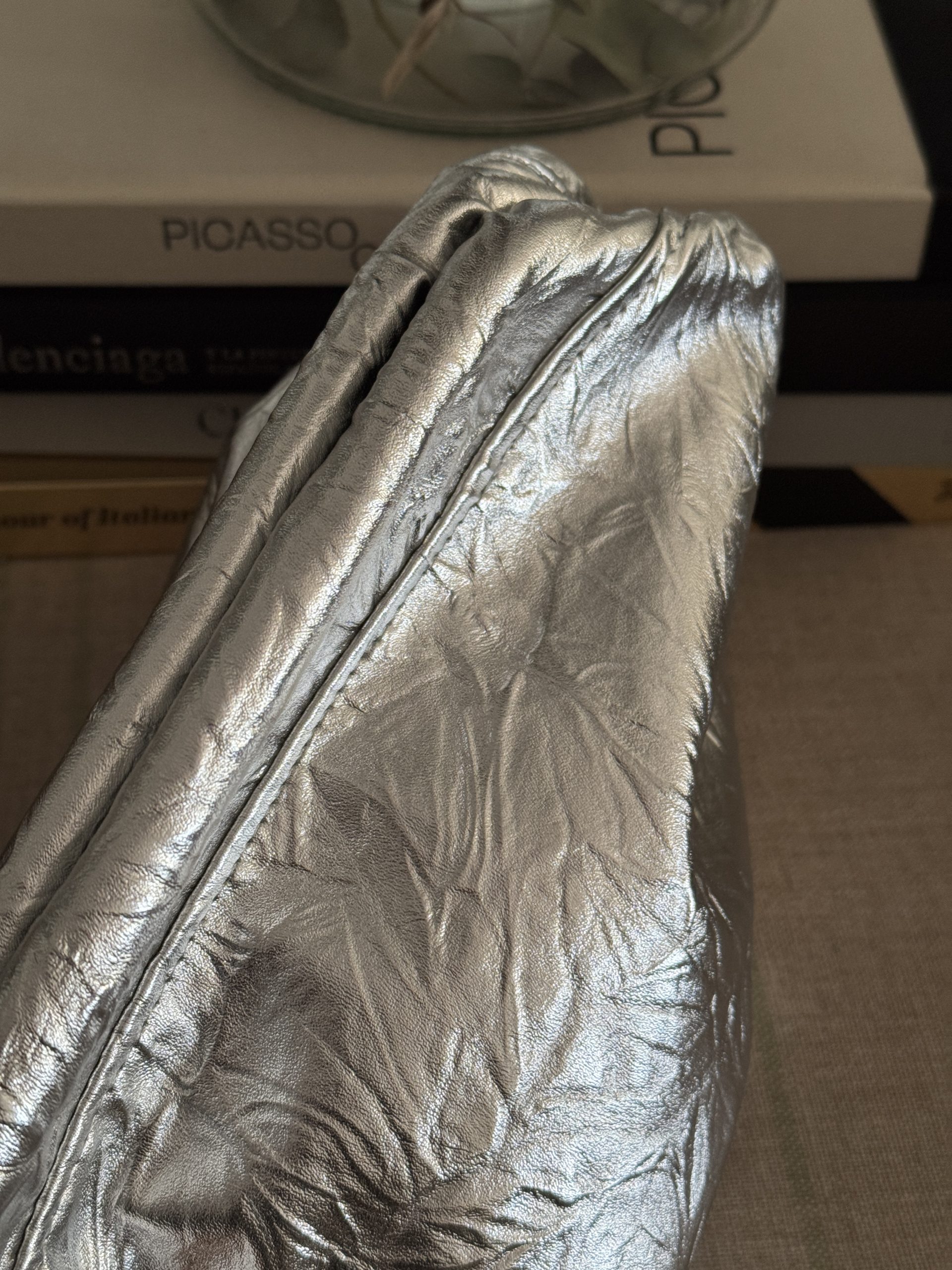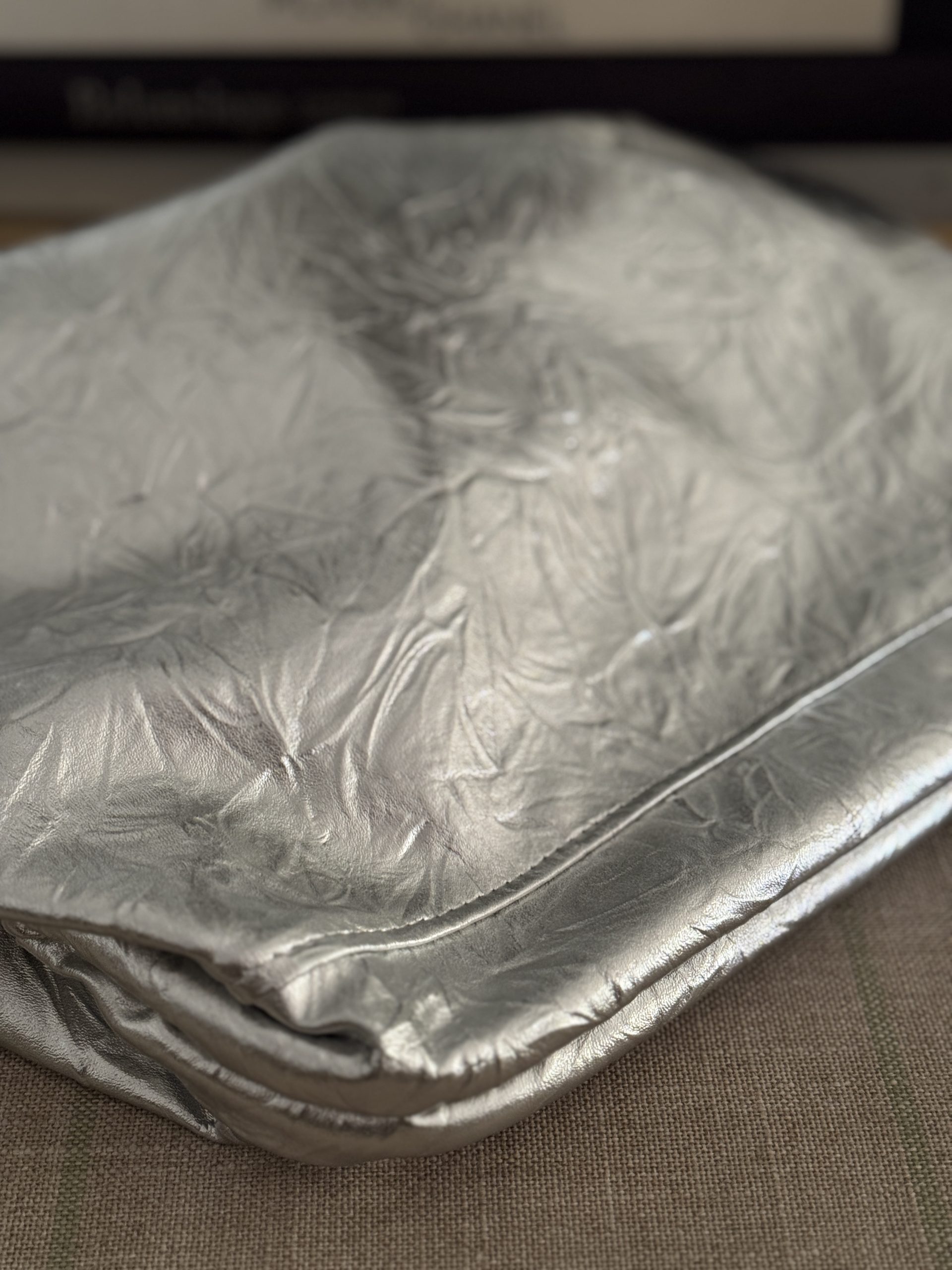 Tejido en plata fuerte forro color crudo, bolsillo interior e incluye asa de eslabones negros de 1 metro