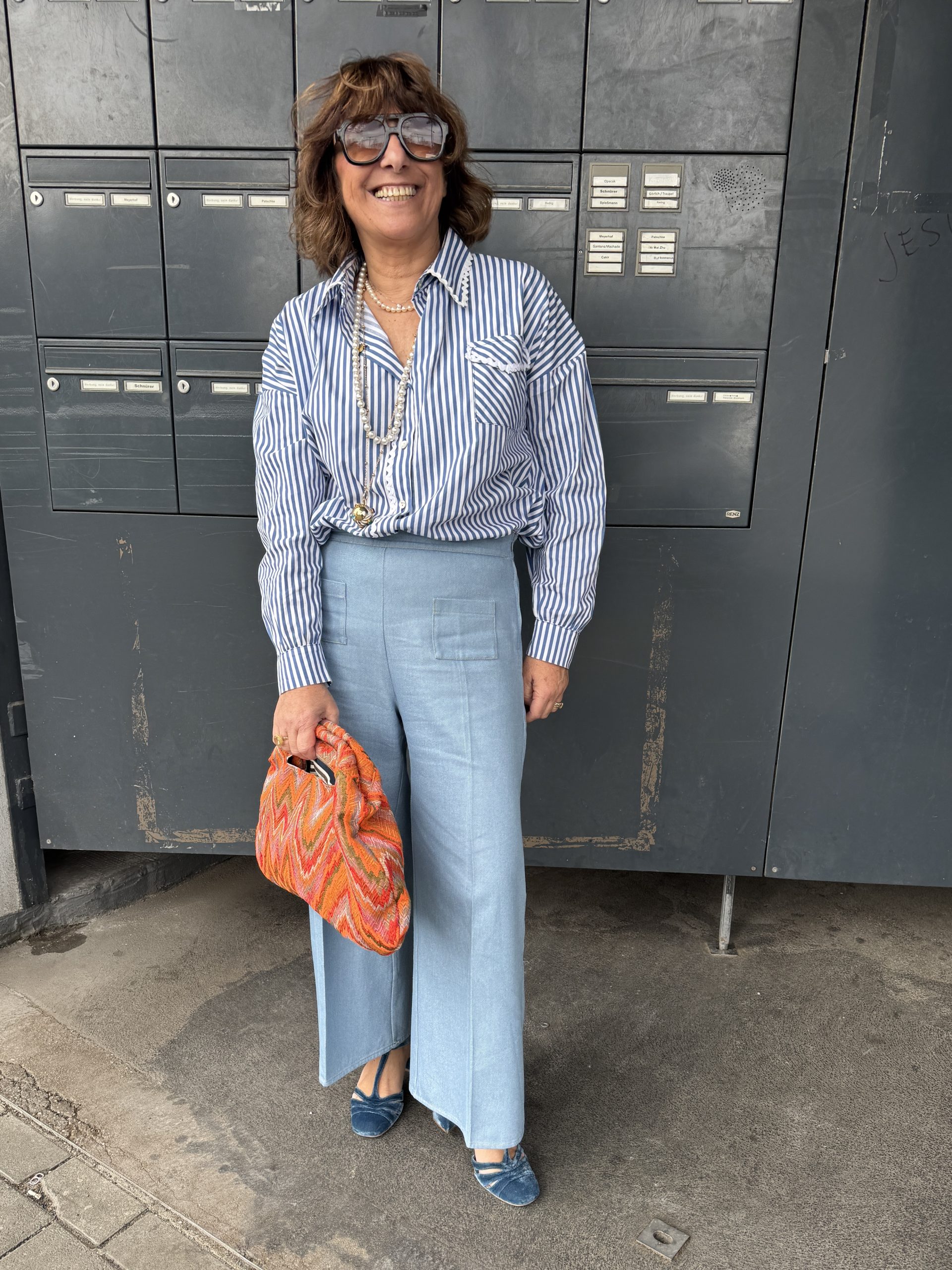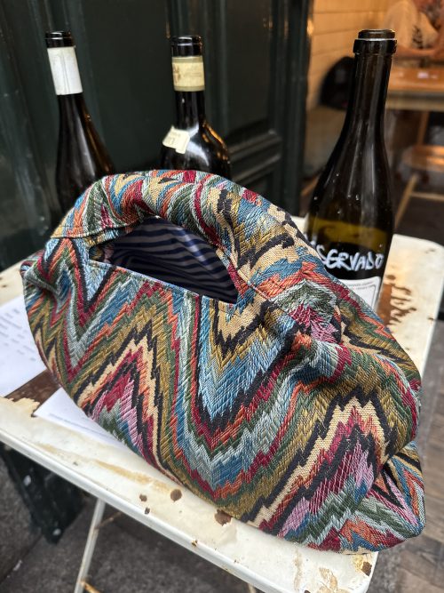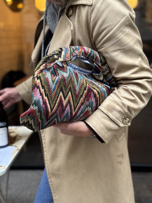 Tela globelino con estampado zig zag, tipo «Missoni», colores naranja, verde, marrón, forro interior rayas marrones de algodón 100×100 y bolsillo interior.