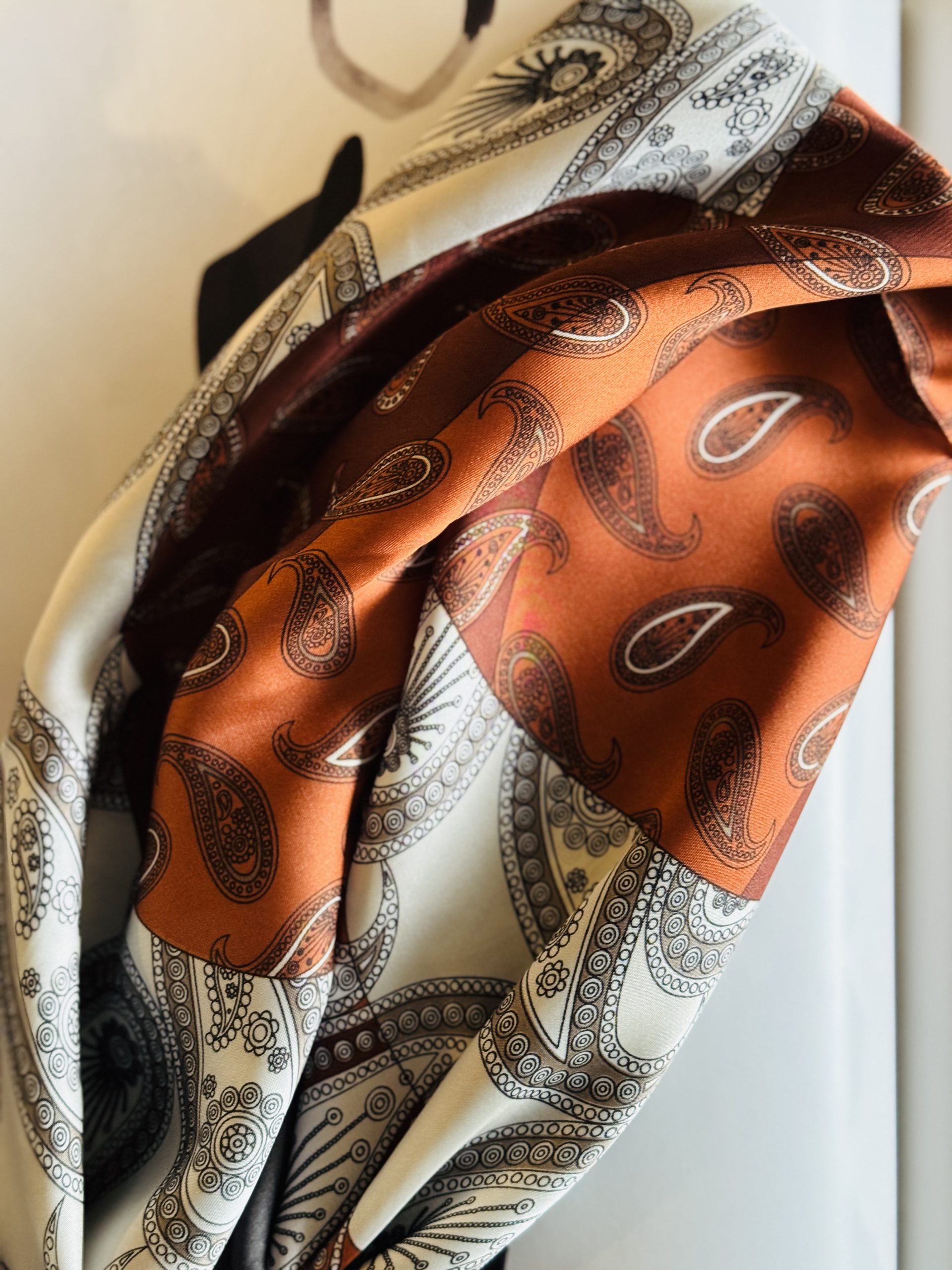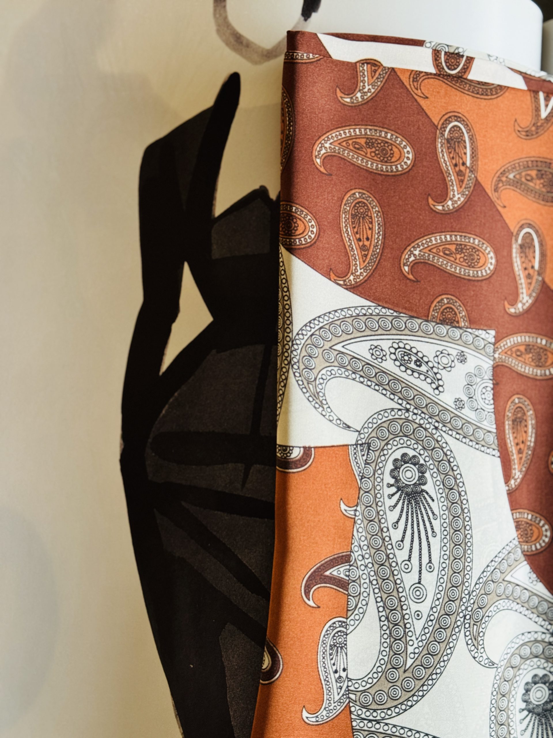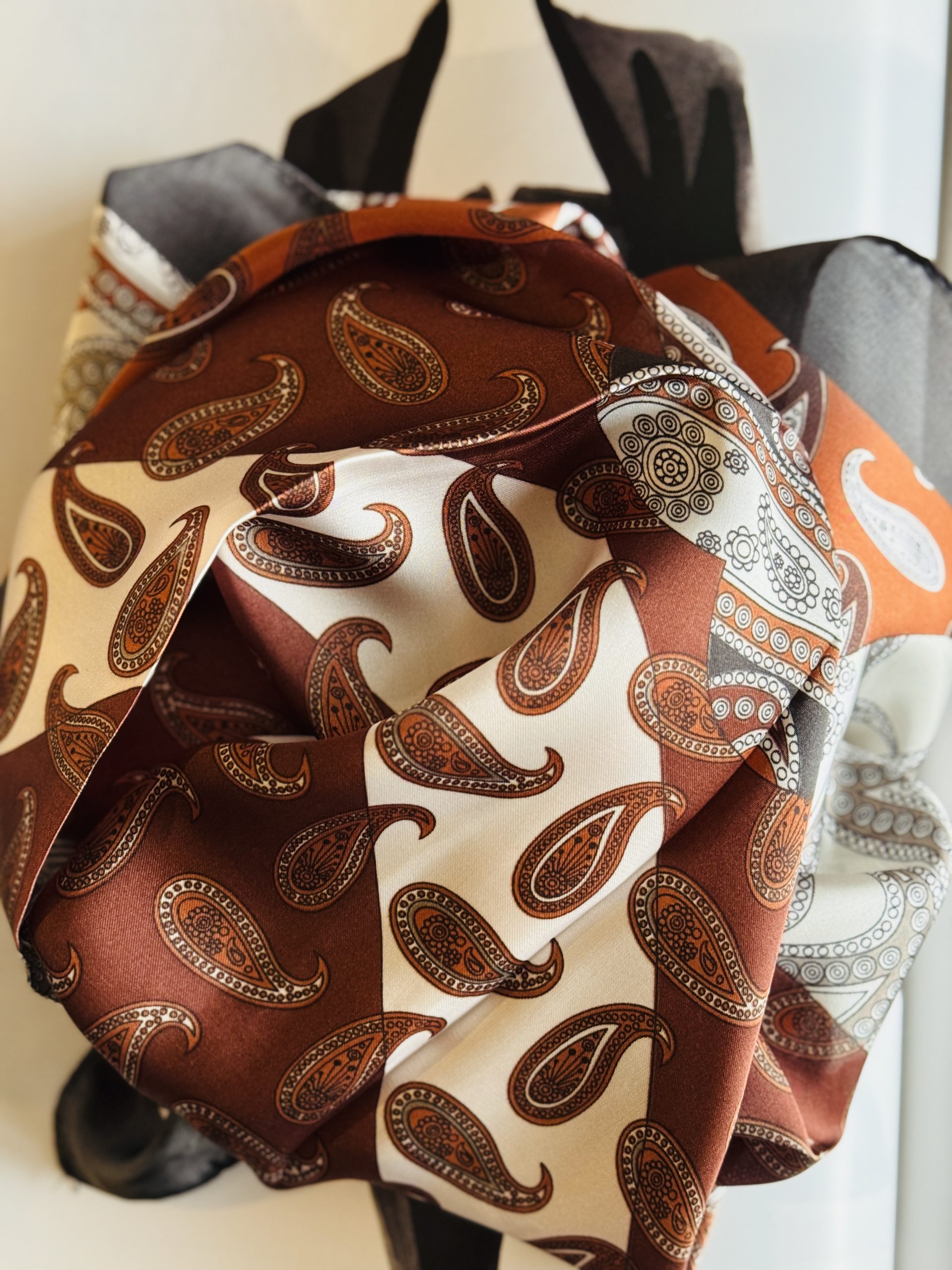 Estampado: paisley en tonos marrones ( amebas), tejido sedoso.