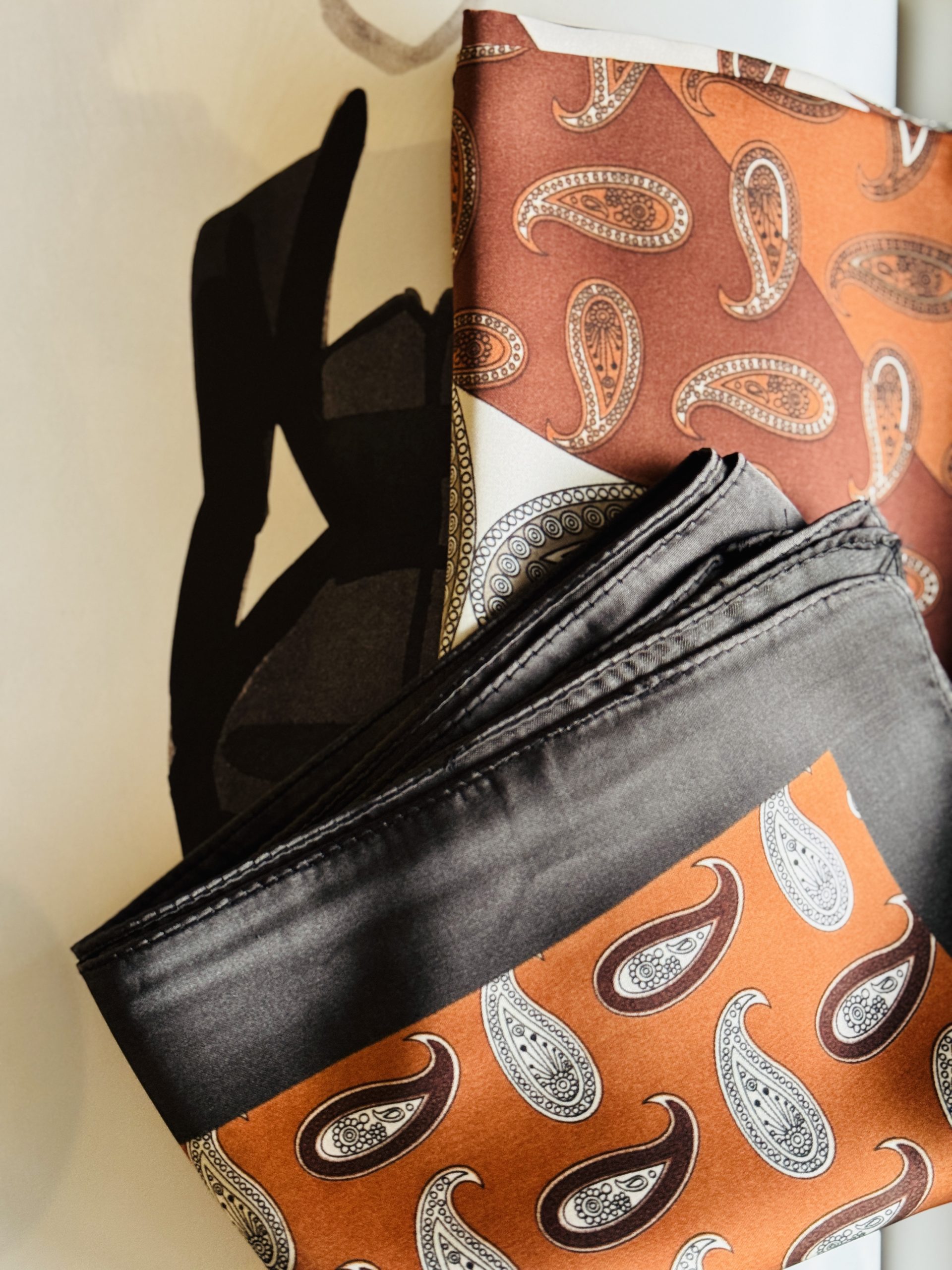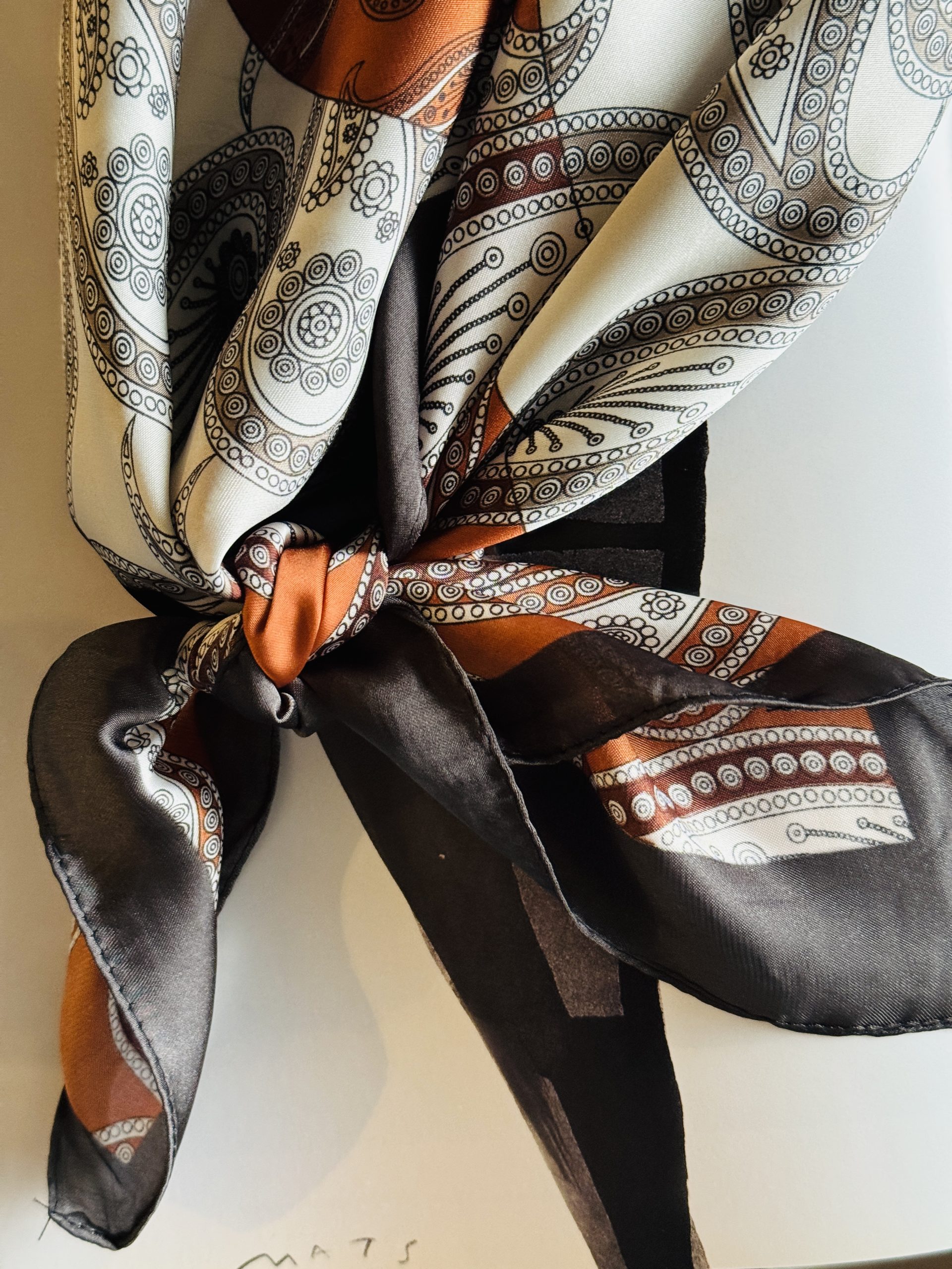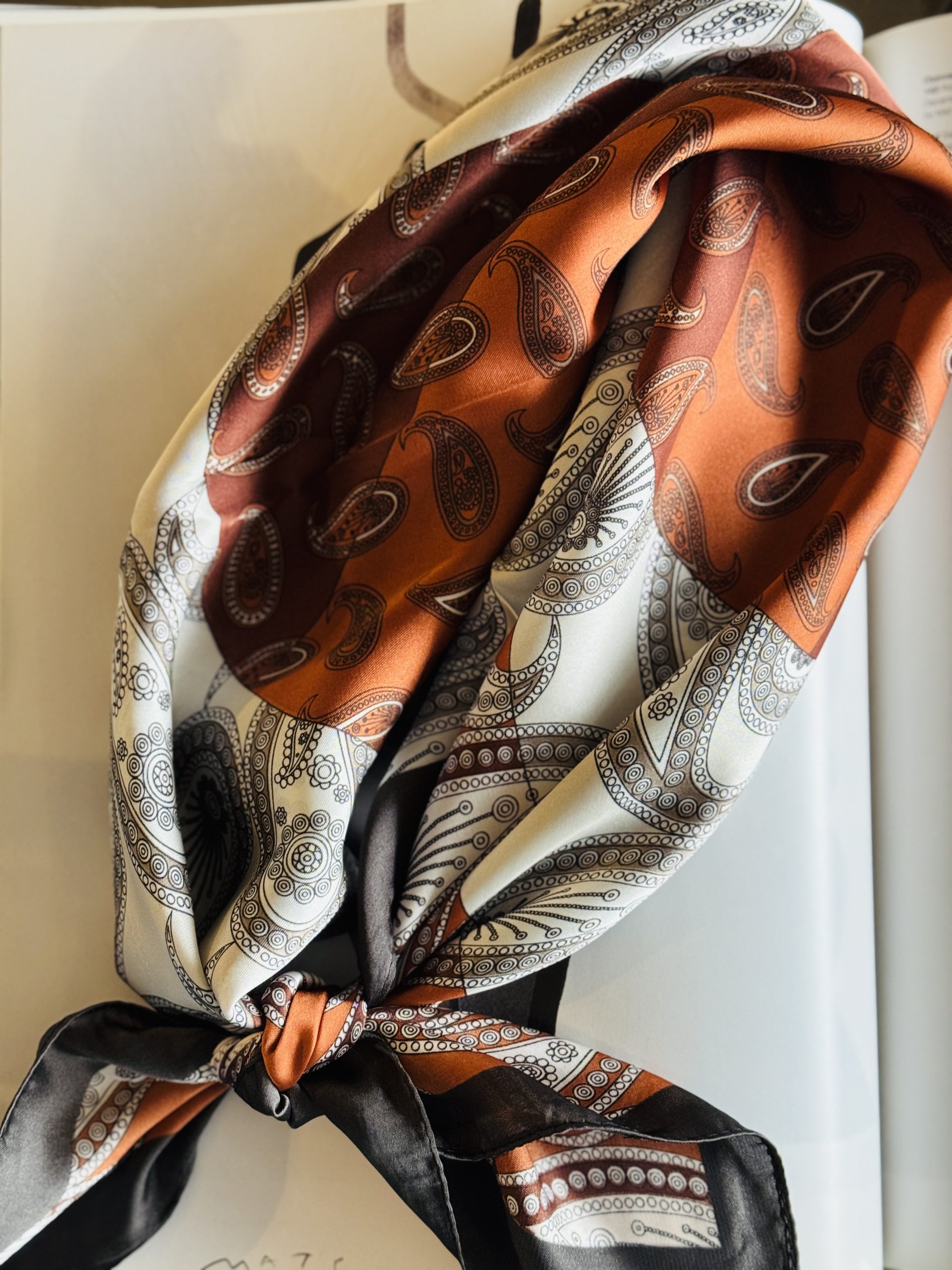 Estampado: paisley en tonos marrones ( amebas), tejido sedoso.