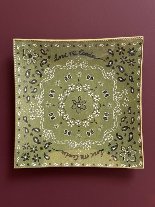 El plato cuadrado con un diseño inspirado en el clásico estampado bandana. El plato tiene un estilo bohemio y vintage, con un toque moderno por la paleta de colores y la composición limpia.